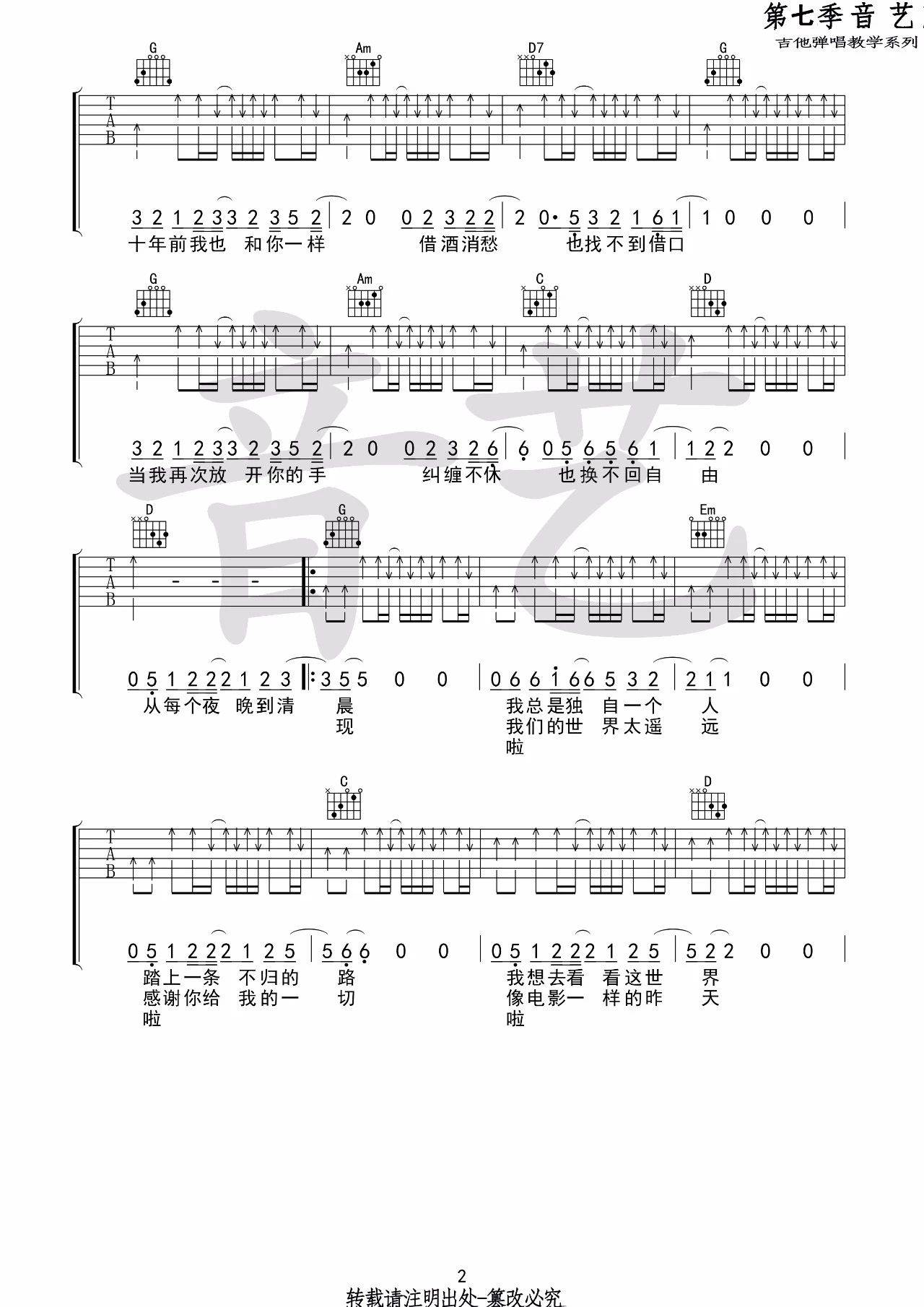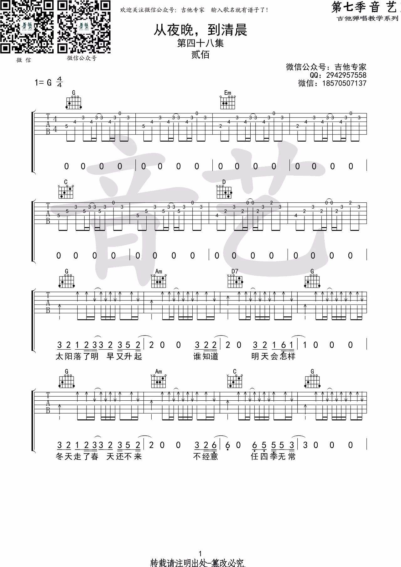 曲谱介绍: 贰佰《从夜晚,到清晨》吉他弹唱谱,采用G调指法编配,音艺吉他编配出品,共有3张高清图谱。