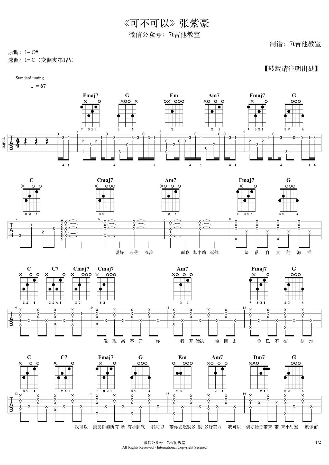 曲谱介绍: 张紫豪《可不可以》吉他弹唱谱,采用C调指法编配,7t吉他教室编配出品,共有2张高清图谱,免翻页排版设计。
