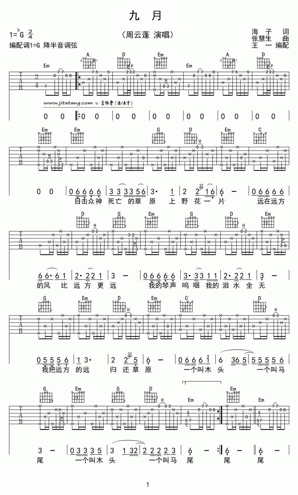 曲谱介绍: 周云蓬《九月》吉他弹唱谱,采用G调指法编配,王一编配出品,共有2张高清图谱,免翻页排版设计。