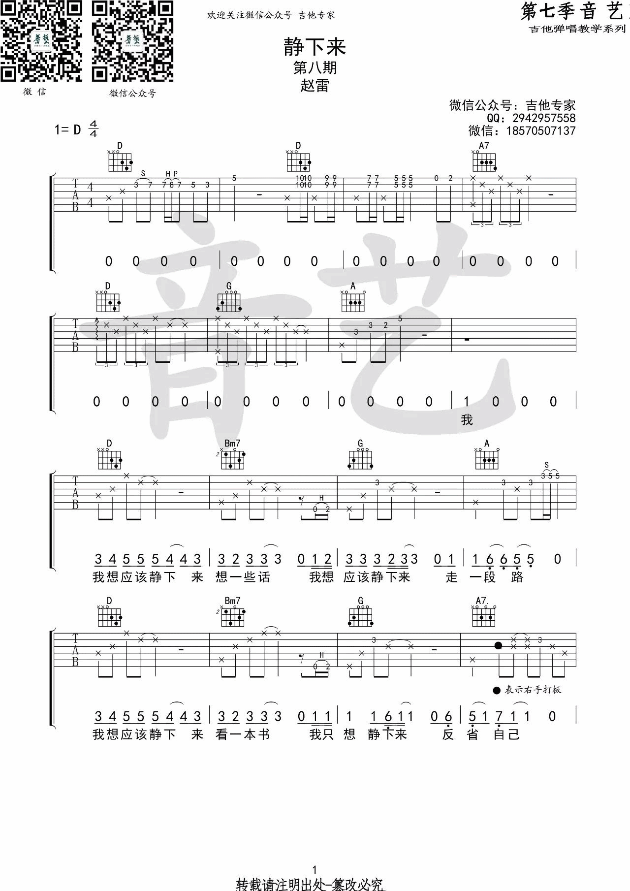 曲谱介绍: 赵雷《静下来》吉他弹唱谱,采用D调指法编配,齐歌吉他编配出品,共有3张高清图谱。