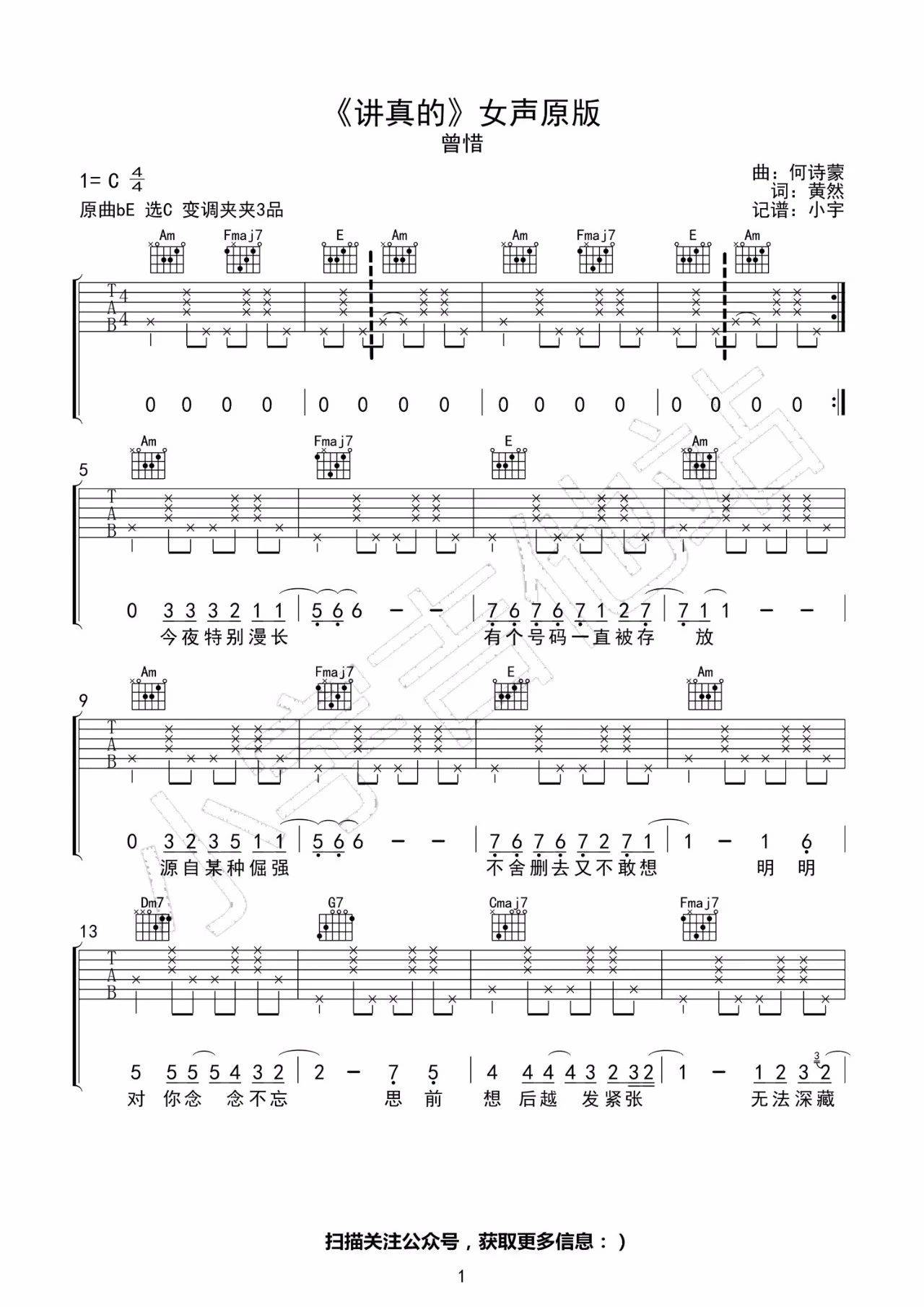 曲谱介绍: 曾惜《讲真的》吉他弹唱谱,采用C调指法编配,小宇吉他编配出品,共有2张高清图谱,免翻页排版设计。