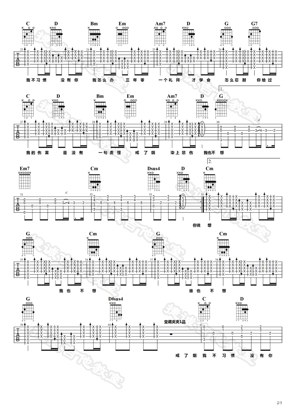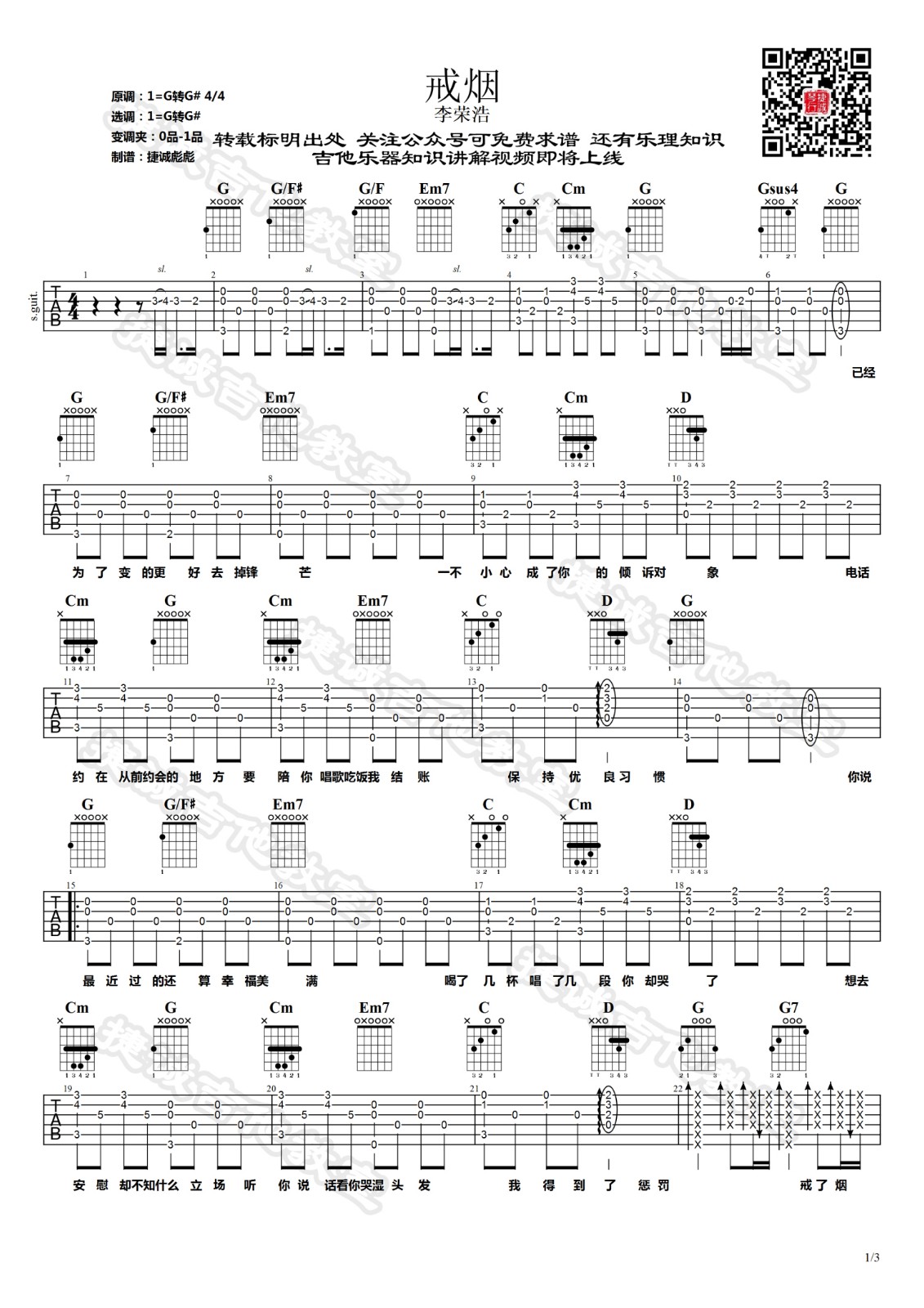 曲谱介绍: 李荣浩《戒烟》吉他弹唱谱,采用G调指法编配,鹤唳吉他教室编配出品,共有3张高清图谱。