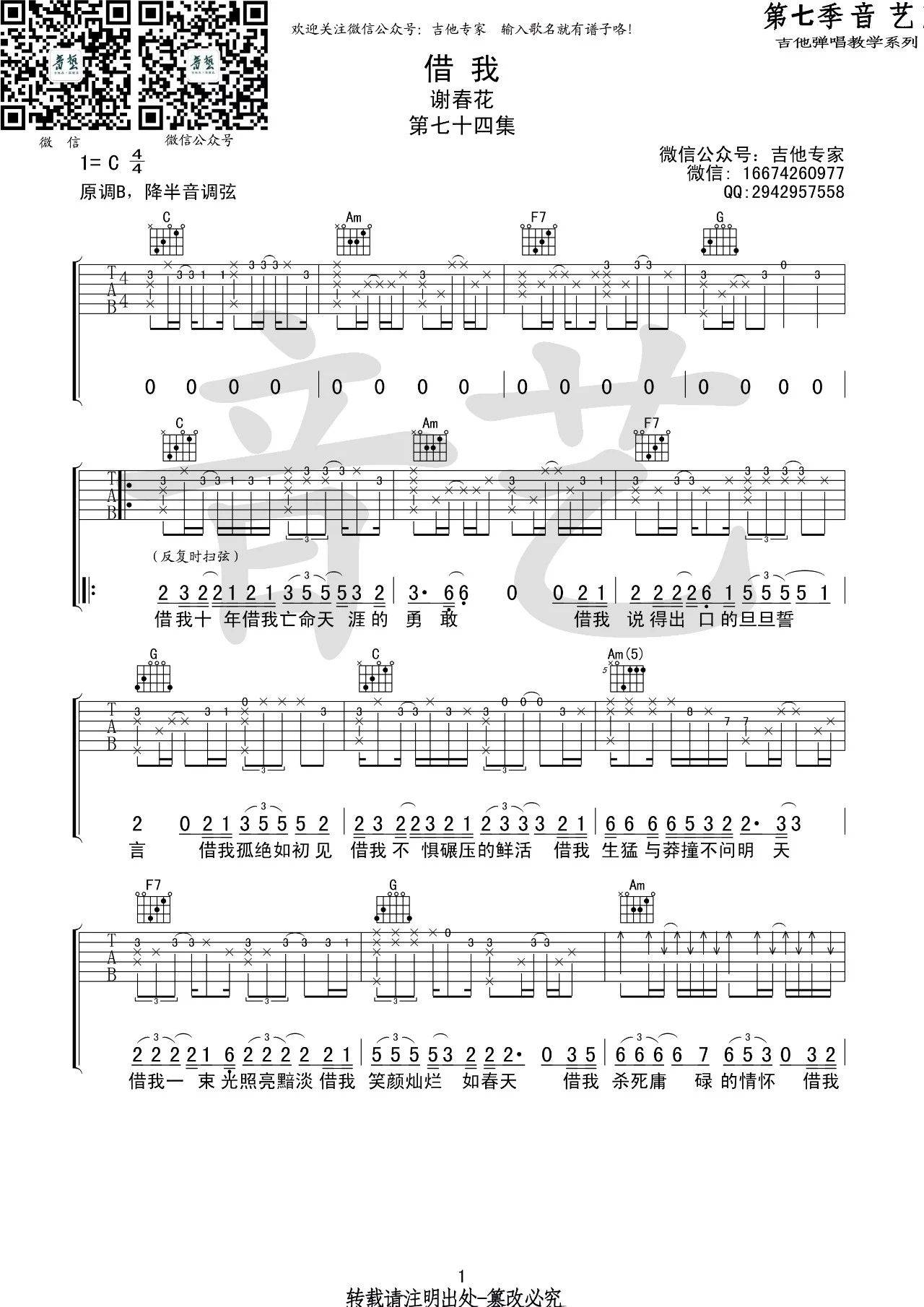 曲谱介绍: 谢春花《借我》吉他弹唱谱,采用C调指法编配,音艺吉他编配出品,共有3张高清图谱。