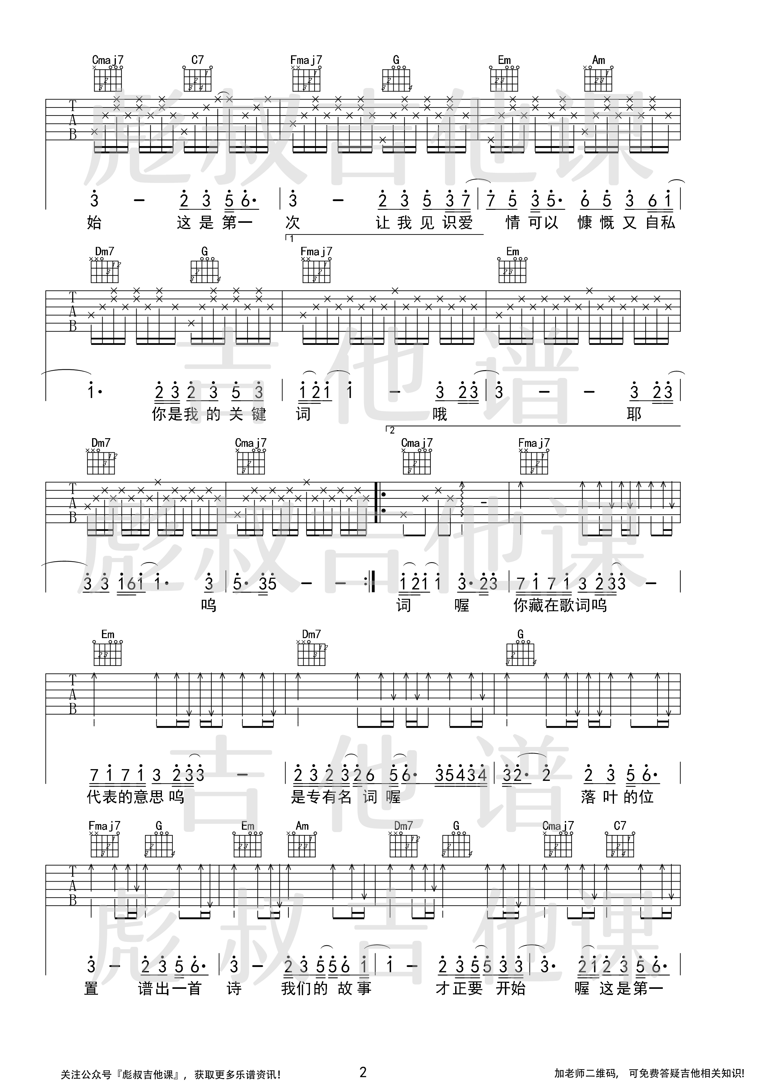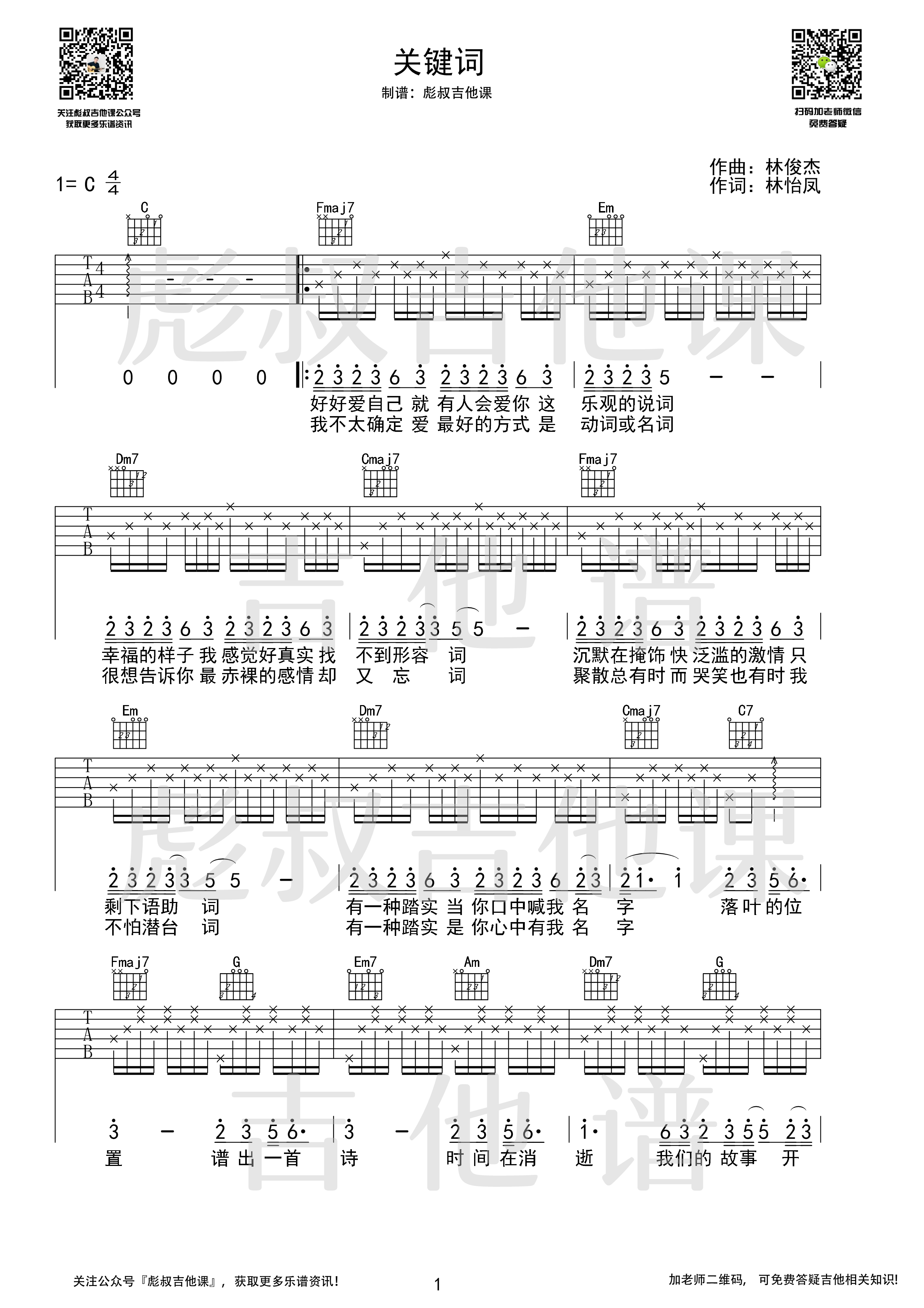 曲谱介绍: 林俊杰《关键词》吉他弹唱谱,采用C调指法编配,共有3张高清图谱。