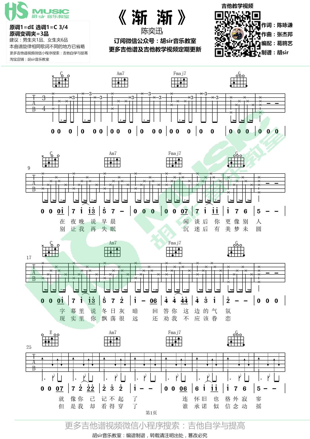 曲谱介绍: 陈奕迅《渐渐》吉他弹唱谱,采用C调指法编配,胡sir吉他教室编配出品,共有3张高清图谱。