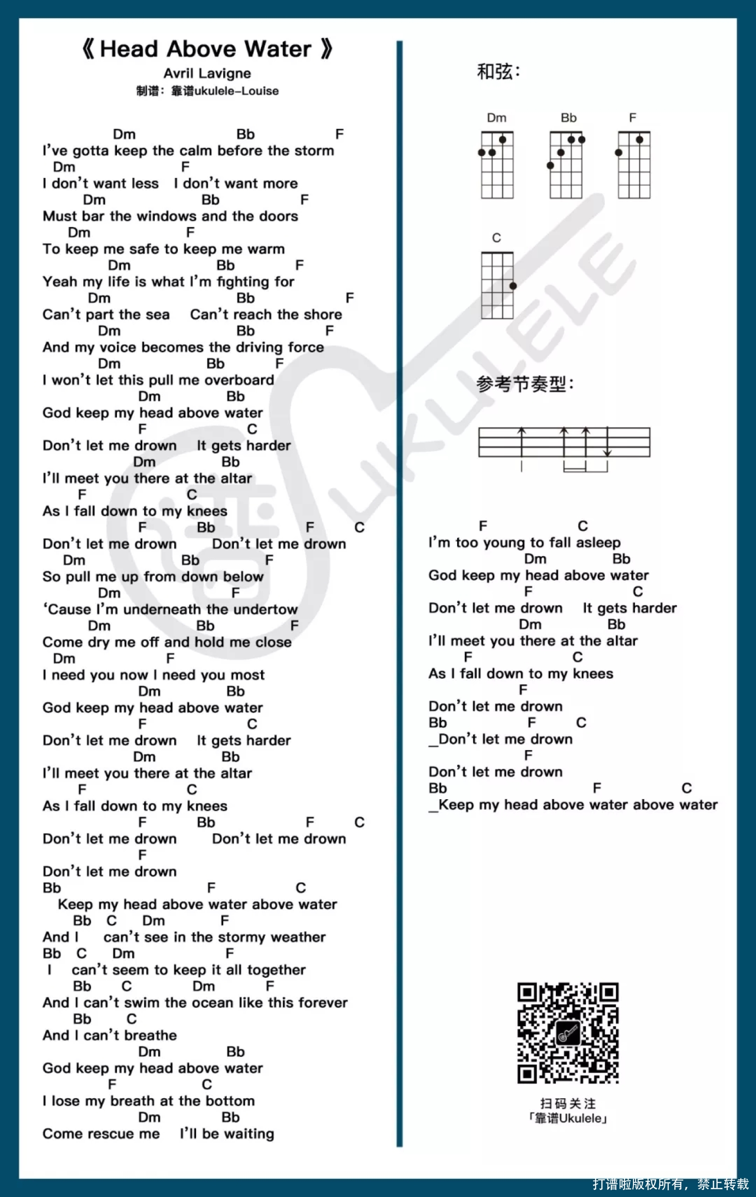 曲谱介绍: 一度以为Avril Lavigne可能不会回归,因为多年前她被诊断患有莱姆病(Lyme disease)……这种病好像是很难根治的…… 也因为这样,Avril Lavigne淡出了歌坛。但是对从学生时代就听她歌的我而言,她永远都是当初那个朋克少女,青春时期中不可缺少的一份记忆。 这次涅槃重生,强势回归真的不易。相信她会给很多同样受到莱姆病折磨的人更多正能量。 追歌的过去,清澈的回忆,叛逆的朋克少女已不在,现在的Avril Lavigne带着自己的故事经历重新回来了,歌词满满的记录着那个在健康低谷时期的真切感受,一个绝望无助的灵魂向主祈求被拯救……(莫名的眼眶泛泪,我们是幸运的,珍惜所拥有的健康吧,因为在被病魔折磨的少数人眼里这些都是奢求)   「Head Above Water」弹唱谱