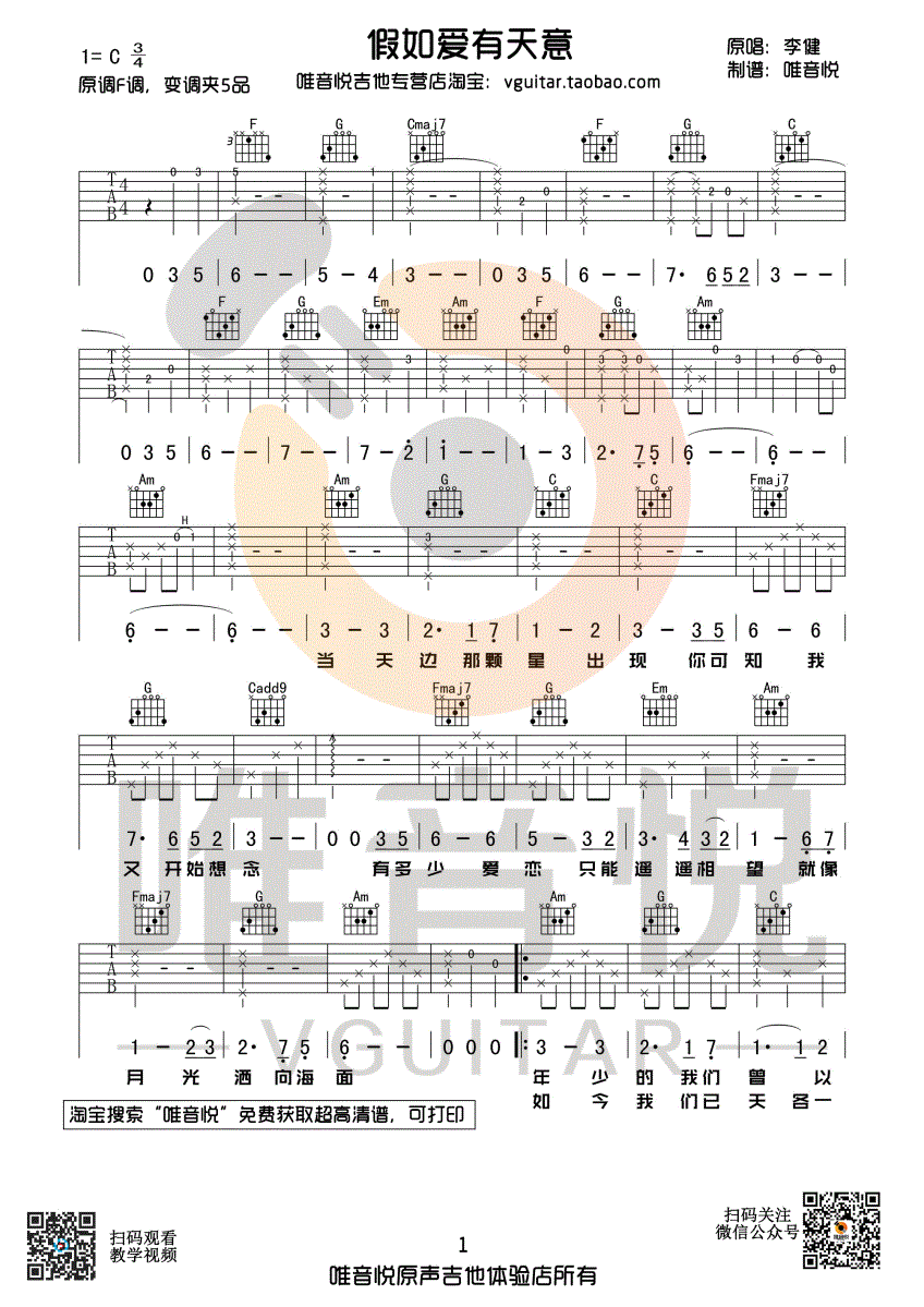 曲谱介绍: 李健《假如爱有天意》吉他弹唱谱,采用C调指法编配,唯音悦编配出品,共有3张高清图谱。