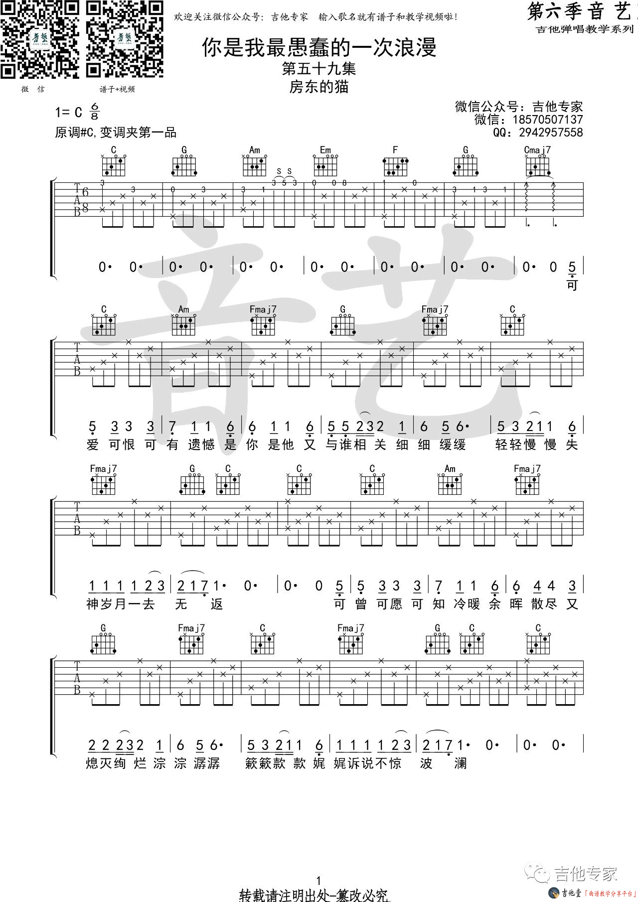 曲谱介绍: 房东的猫《你是我最愚蠢的一次浪漫》吉他弹唱谱,采用C调指法编配,音艺吉他编配出品,共有3张高清图谱。