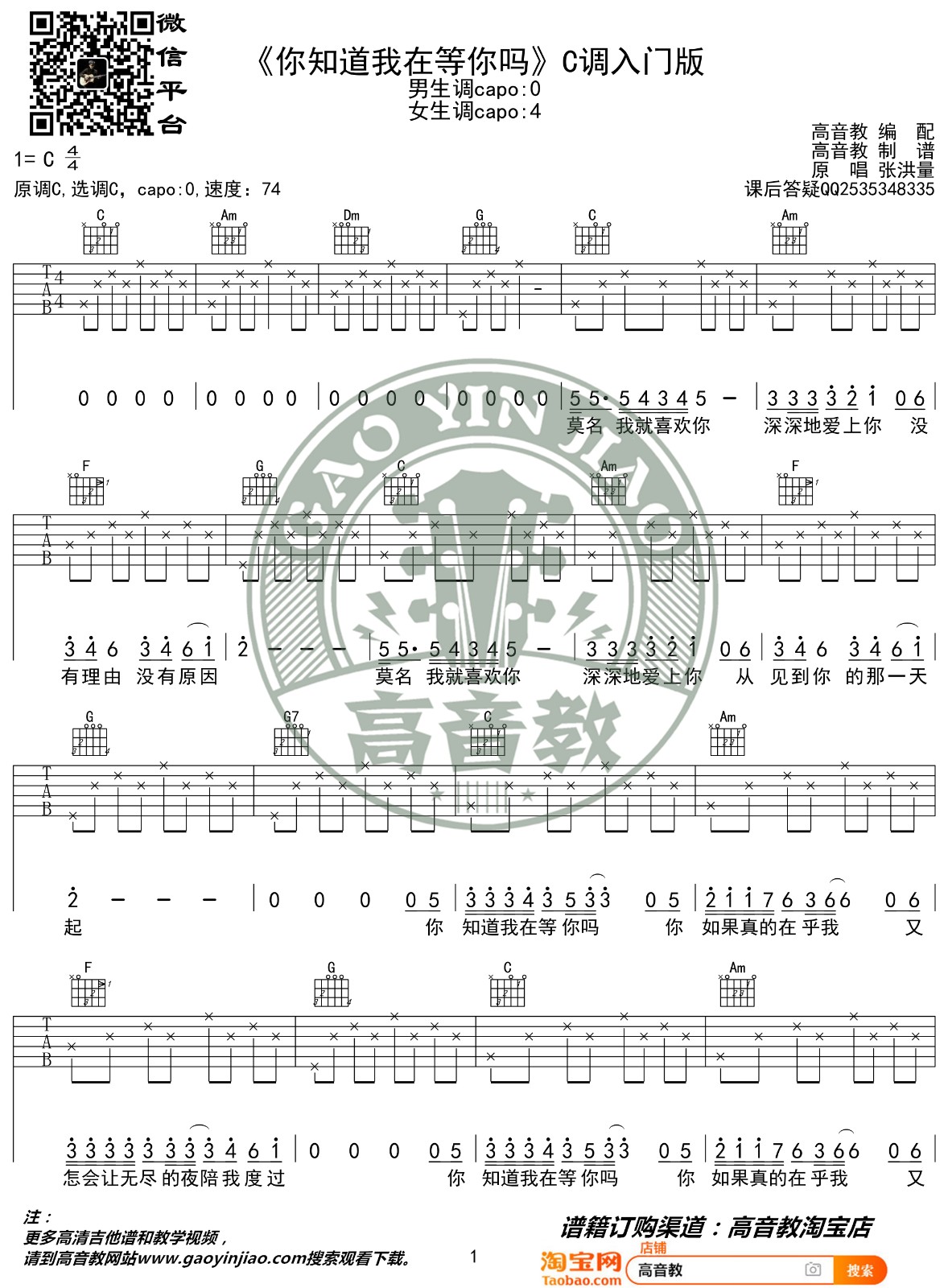 曲谱介绍: 张洪量《你知道我在等你吗》吉他弹唱谱,采用C调指法编配,高音教编配出品,共有2张高清图谱,免翻页排版设计。