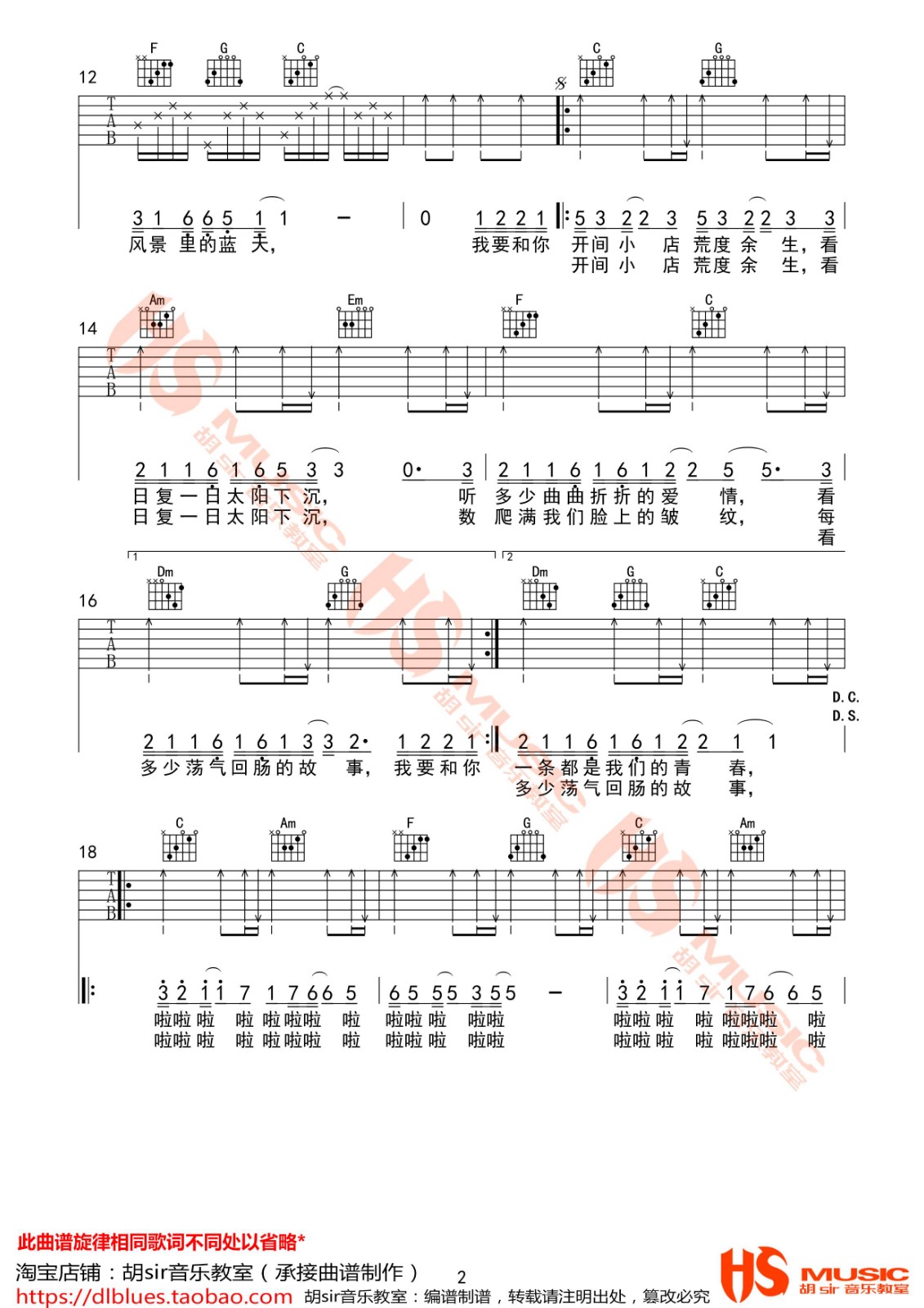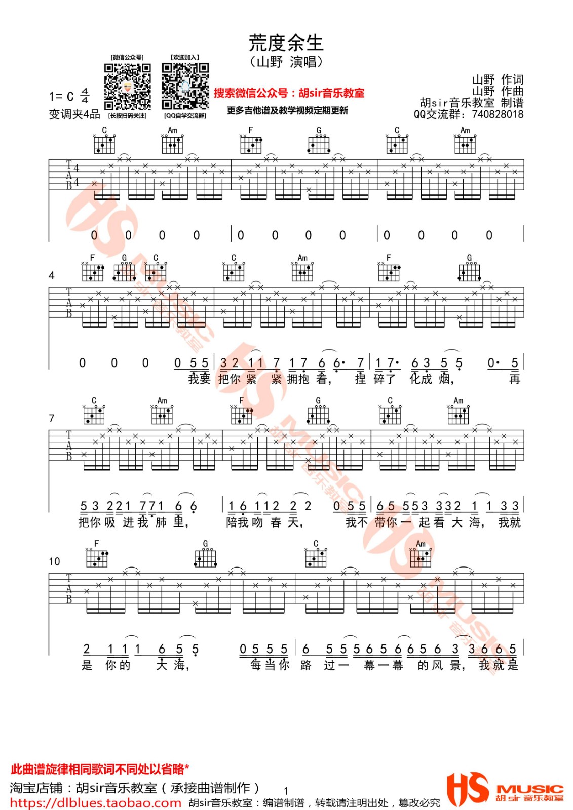 曲谱介绍: 山野《荒度余生》吉他弹唱谱,采用C调指法编配,胡sir吉他教室编配出品,共有3张高清图谱。
