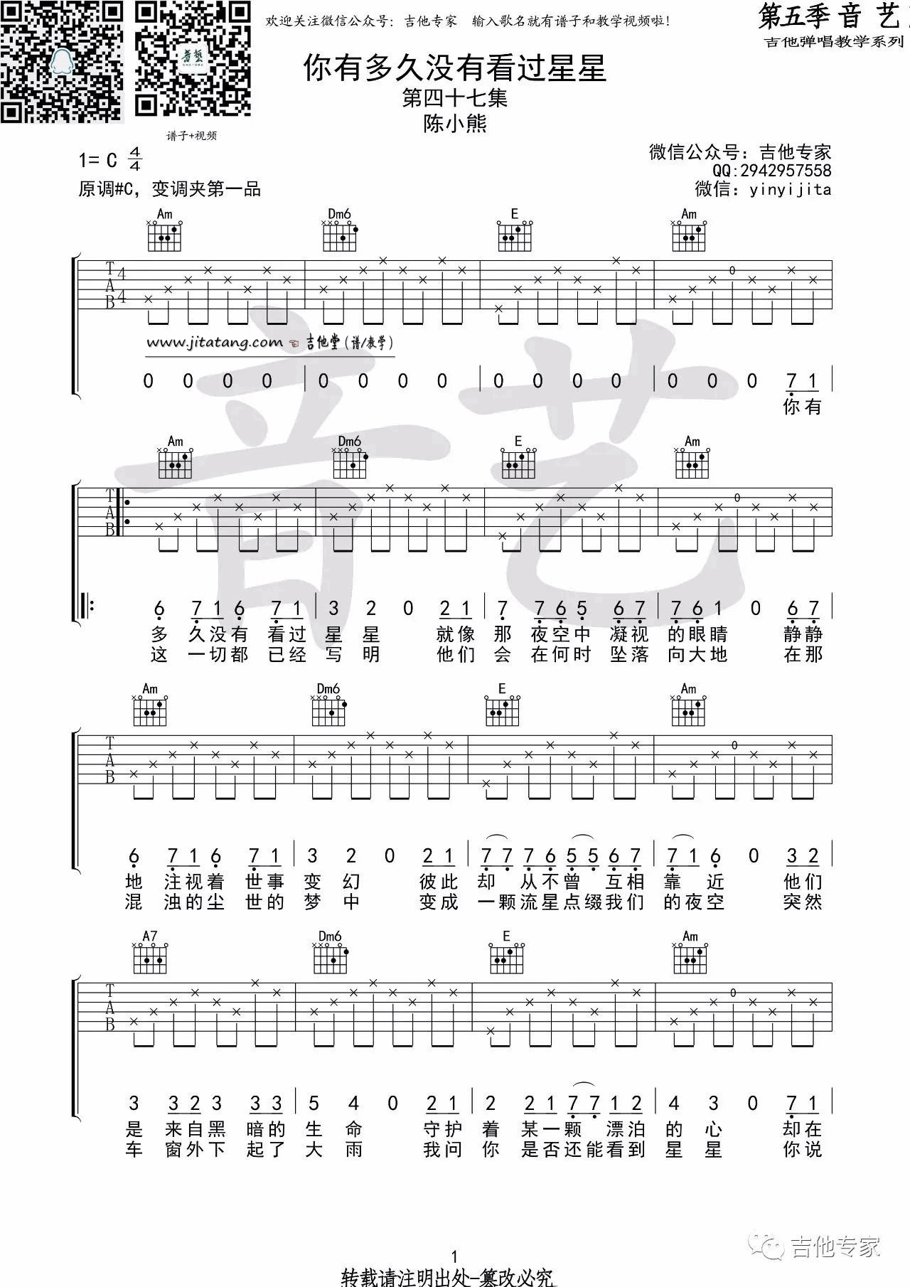 曲谱介绍: 陈小熊《你有多久没有看过星星》吉他弹唱谱,采用C调指法编配,音艺吉他编配出品,共有3张高清图谱。