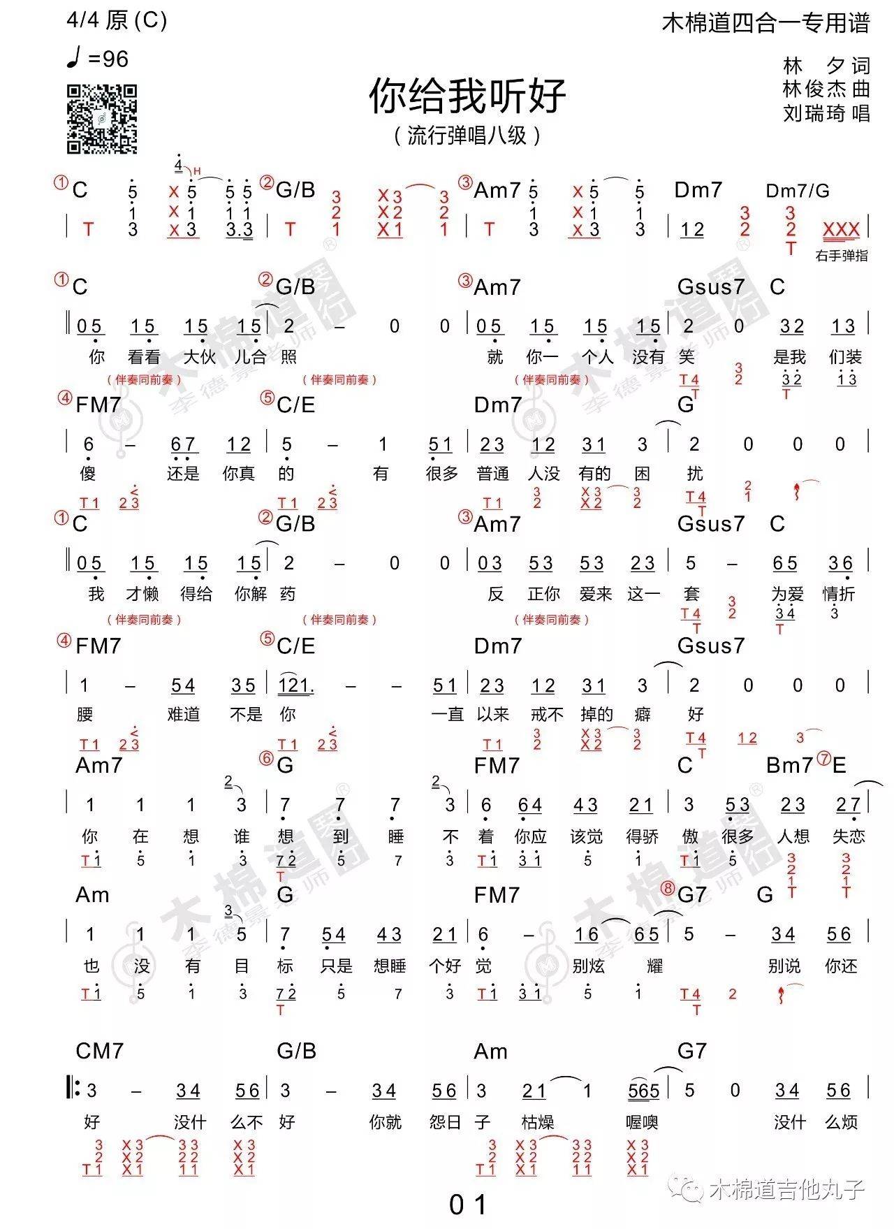 曲谱介绍: 刘瑞琦《你给我听好》吉他弹唱谱,采用C调指法编配,木棉道编配出品,共有2张高清图谱,免翻页排版设计。