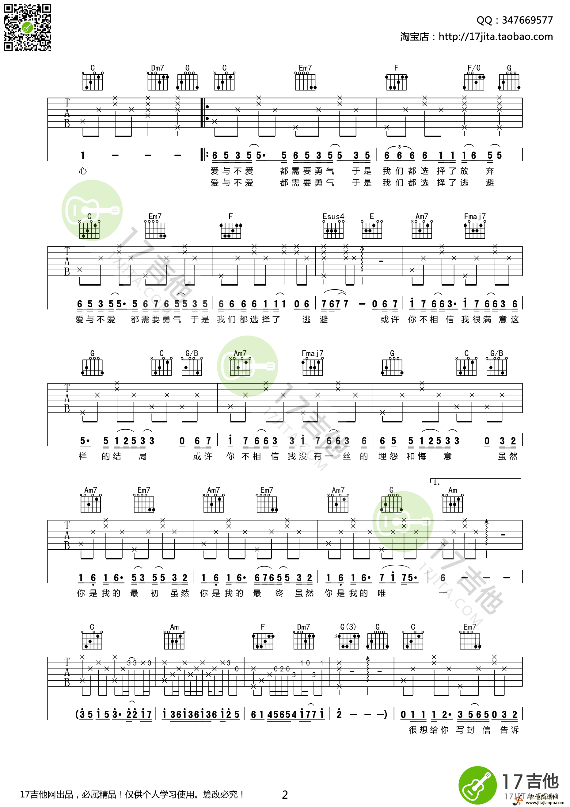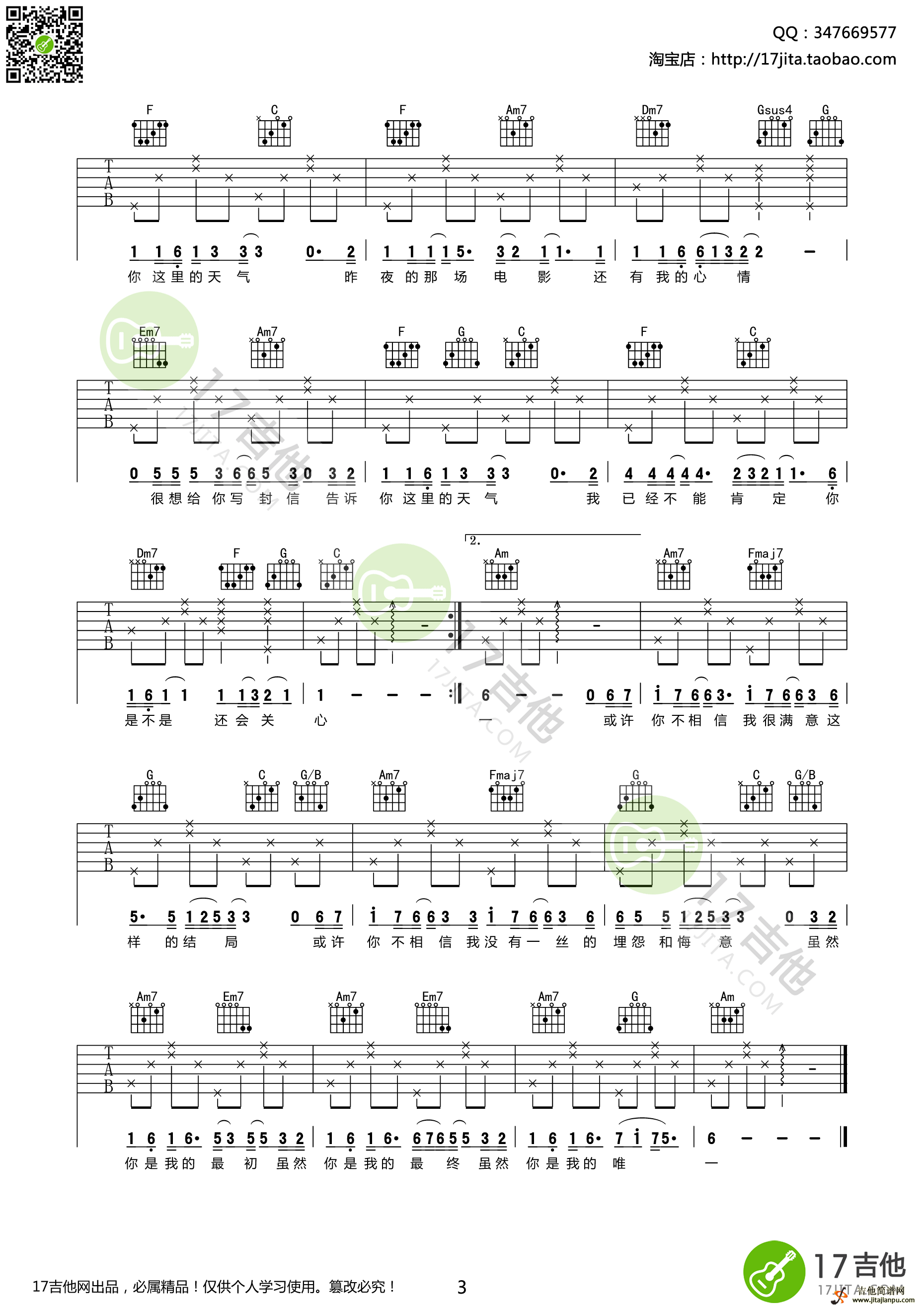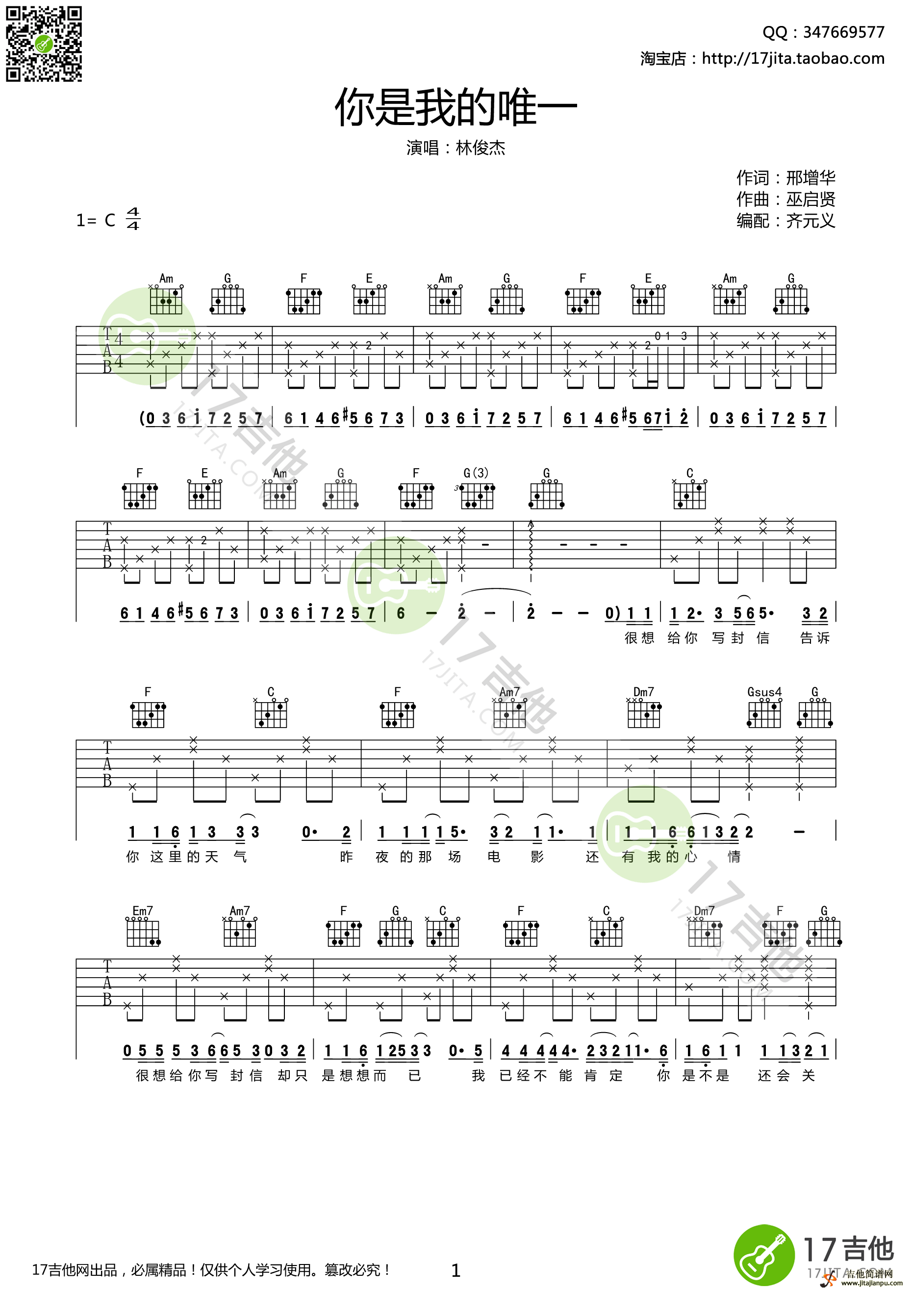 曲谱介绍: 林俊杰《你是我的唯一》吉他弹唱谱,采用C调指法编配,17吉他编配出品,共有3张高清图谱。