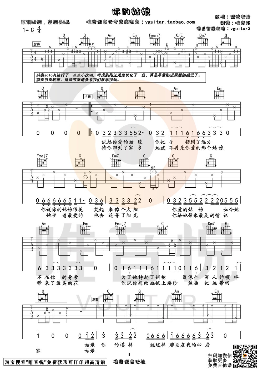 曲谱介绍: 隔壁老樊《你的姑娘》吉他弹唱谱,采用C调指法编配,唯音悦编配出品,共有2张高清图谱,免翻页排版设计。