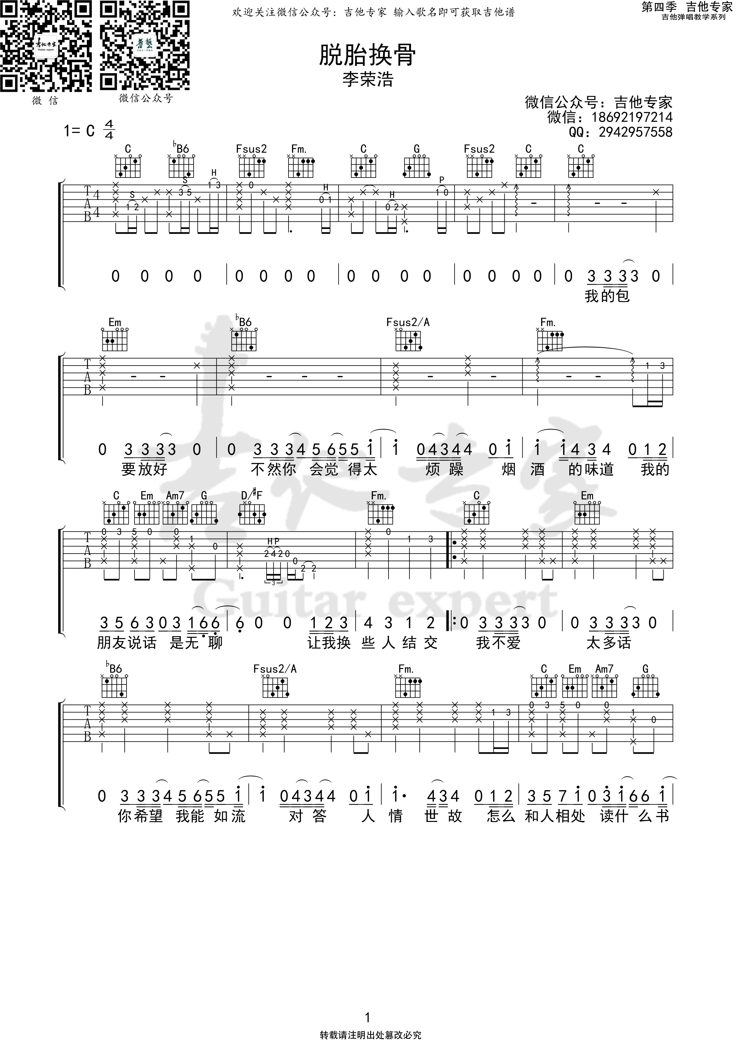 曲谱介绍: 李荣浩《脱胎换骨》吉他弹唱谱,采用C调指法编配原版,原版吉他专家编配出品,共有3张高清图谱。