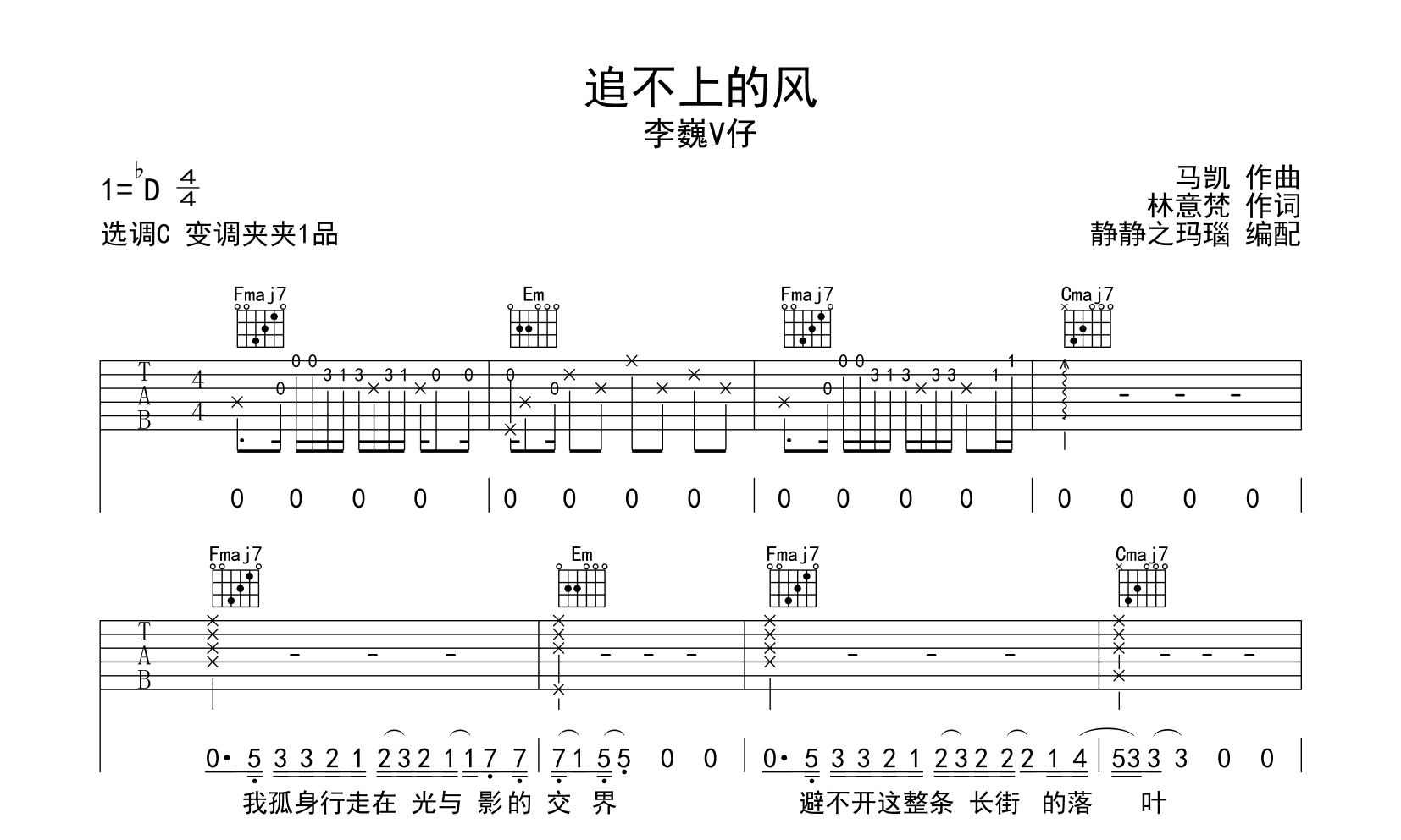 曲谱介绍: 李巍V仔《追不上的风》吉他谱,由@静静之玛瑙制谱,《追不上的风》吉他弹唱谱,共两张图片谱,本谱采用C调和弦指法编配,节奏为4/4拍,速度为85拍每分钟,弹唱建议变调夹夹1品,也可以根据个人嗓音找到一个舒服的位置,难度初级。
