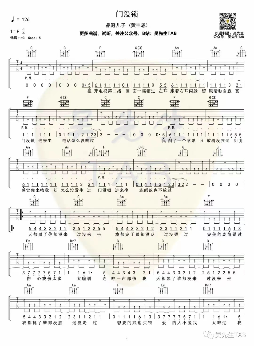 曲谱介绍: 品冠儿子(黄韦恩)《门没锁》吉他弹唱谱,采用C调指法编配,共有2张高清图谱,免翻页排版设计。