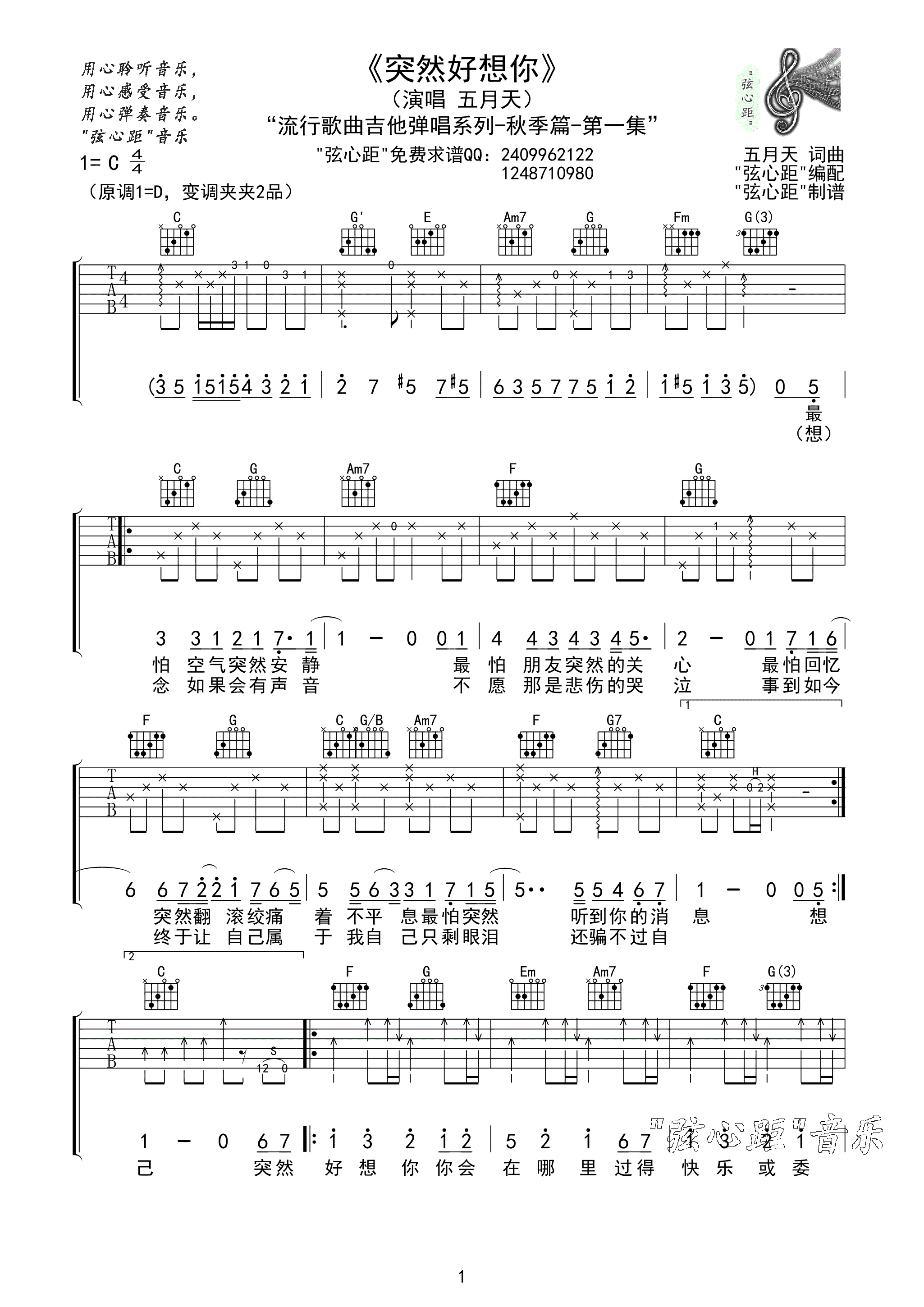 曲谱介绍: 五月天《突然好想你》吉他弹唱谱,采用D调指法编配,弦心距编配出品,共有4张高清图谱。