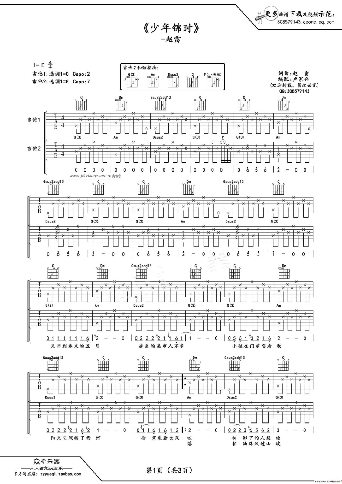 曲谱介绍: 赵雷《少年锦时》吉他弹唱谱,采用C调指法编配,卢家兴编配出品,共有3张高清图谱。