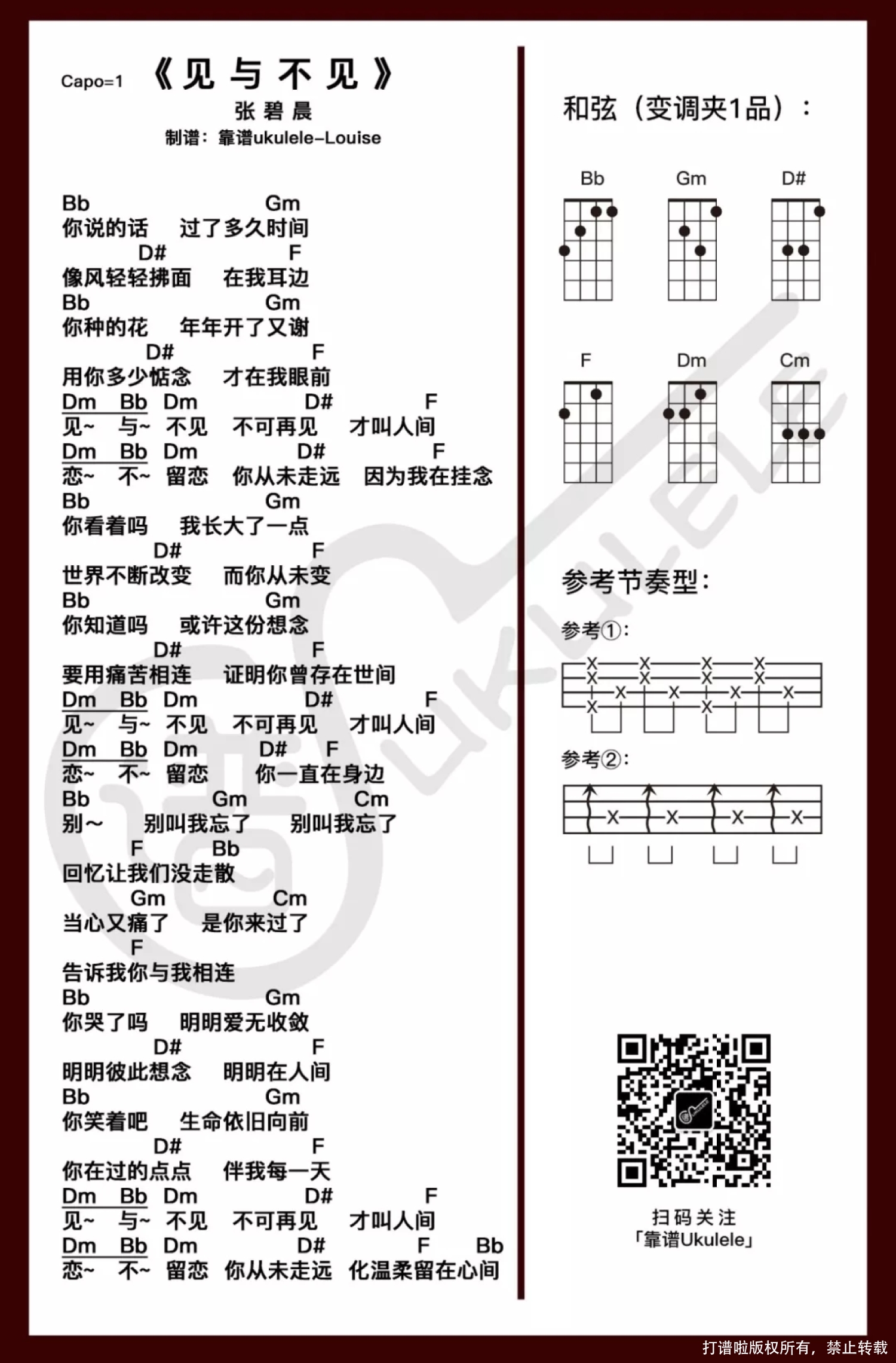 曲谱介绍: 这首是算比较近期求谱的一首歌,算是新歌吧,今年6月发行的。亏的求谱让我也更新了一下曲库,真的好多歌都是Louise日常不会主动去点来听的歌。 说回这首歌,一首在演唱会首唱就让很多人动容的歌。一首有温度的,字字走心的歌。充满真挚,感受悲伤与无奈,让人心疼,也获得不少共鸣。 时间宝贵,不管是身边的亲人、爱人、朋友,随着时间流逝,那些过往的点点滴滴都值得格外珍惜。不负自己,免余生后悔。   ———我是土味分割线———   这次的谱有变调夹哟~!如果不使用变调夹等于是降调了,用与不用根据个人需要啦,我是没有夹,夹了唱不上去(尴尬……)。 节奏型的部分呢,除了提供参考的,也可以综合用一下,像这样: (↑ 3) (12 3) (↑ 3) (12 3),伴奏效果也会些许不同。   「见与不见」弹唱谱