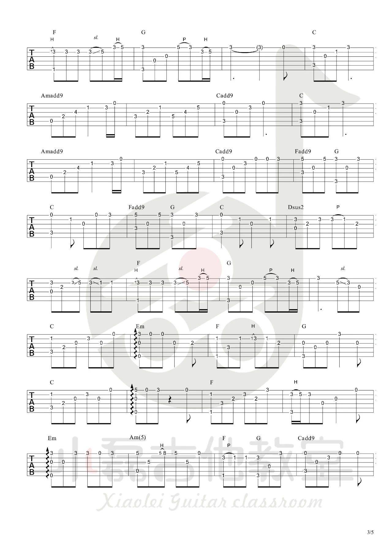 曲谱介绍: 赵雷《成都》吉他独奏谱,小磊吉他教室编配出品,共有5张高清图谱。