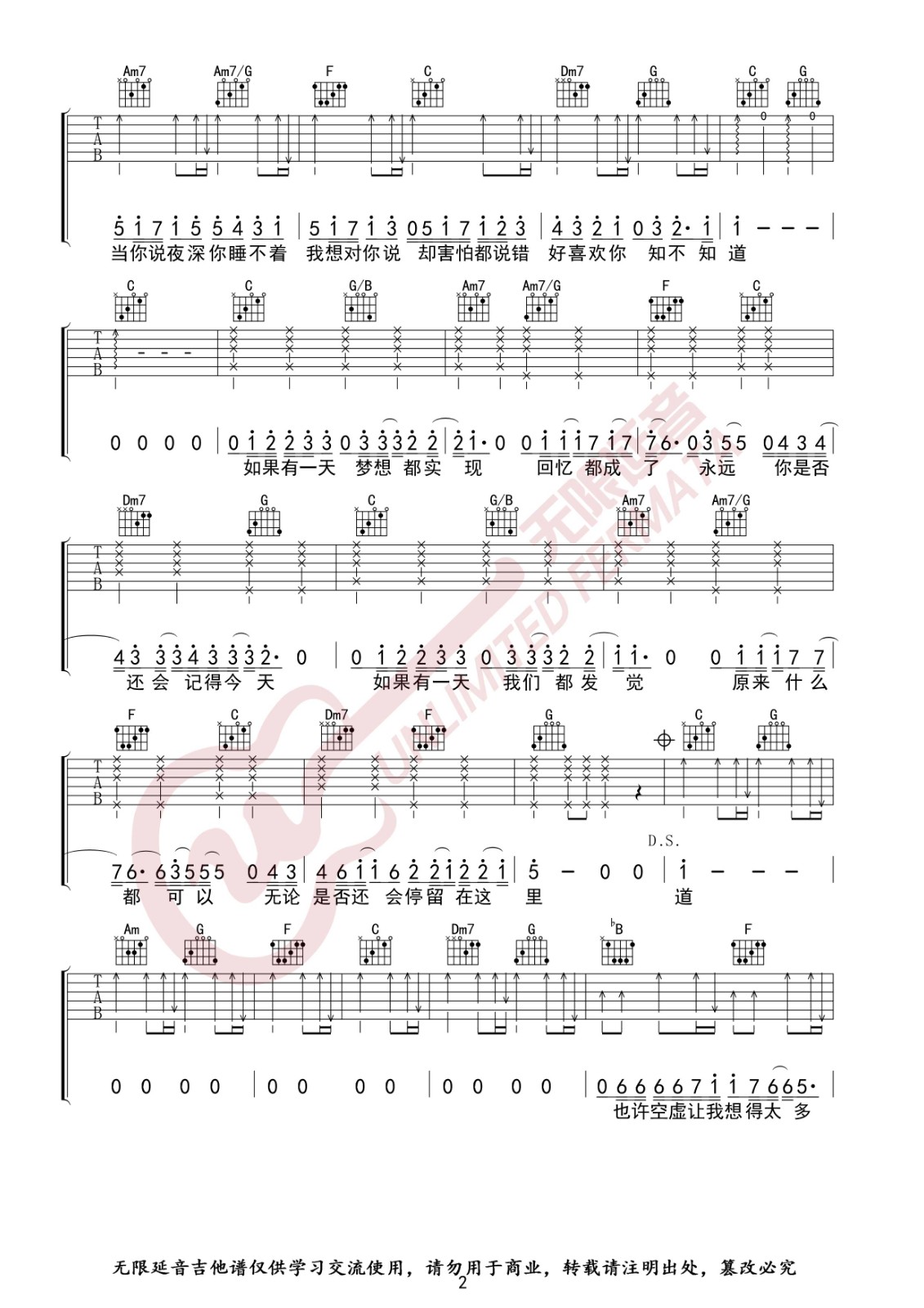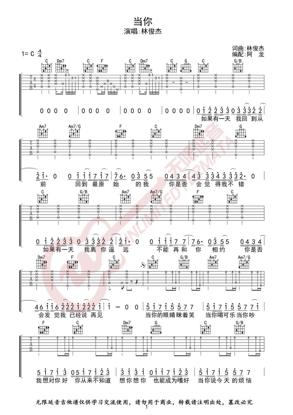 曲谱介绍: 林俊杰《当你》吉他弹唱谱,采用C调指法编配,无限延音编配出品,共有3张高清图谱。