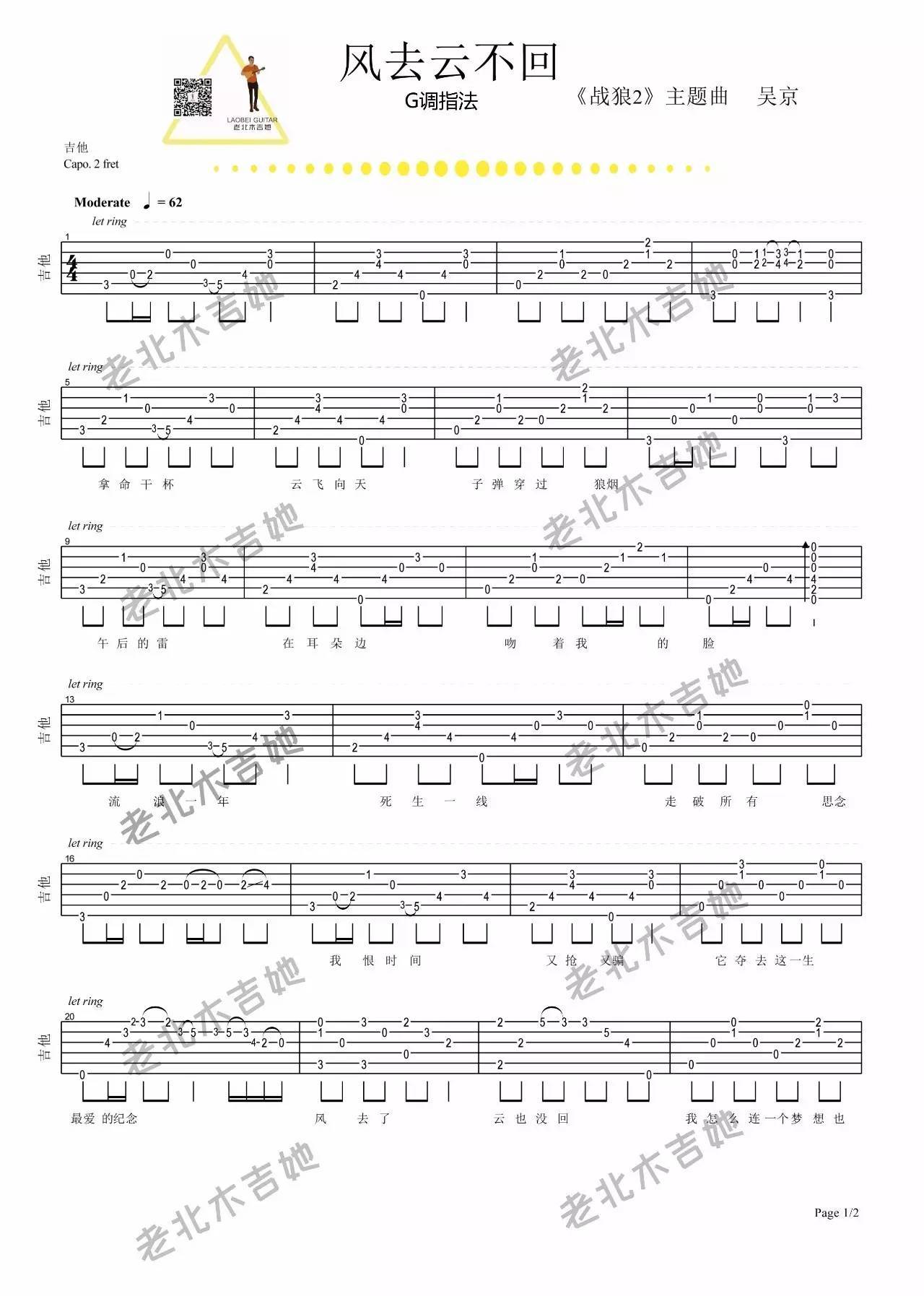 曲谱介绍: 吴京《风去云不回》吉他弹唱谱,采用G调指法编配,老北木吉他编配出品,共有2张高清图谱,免翻页排版设计。