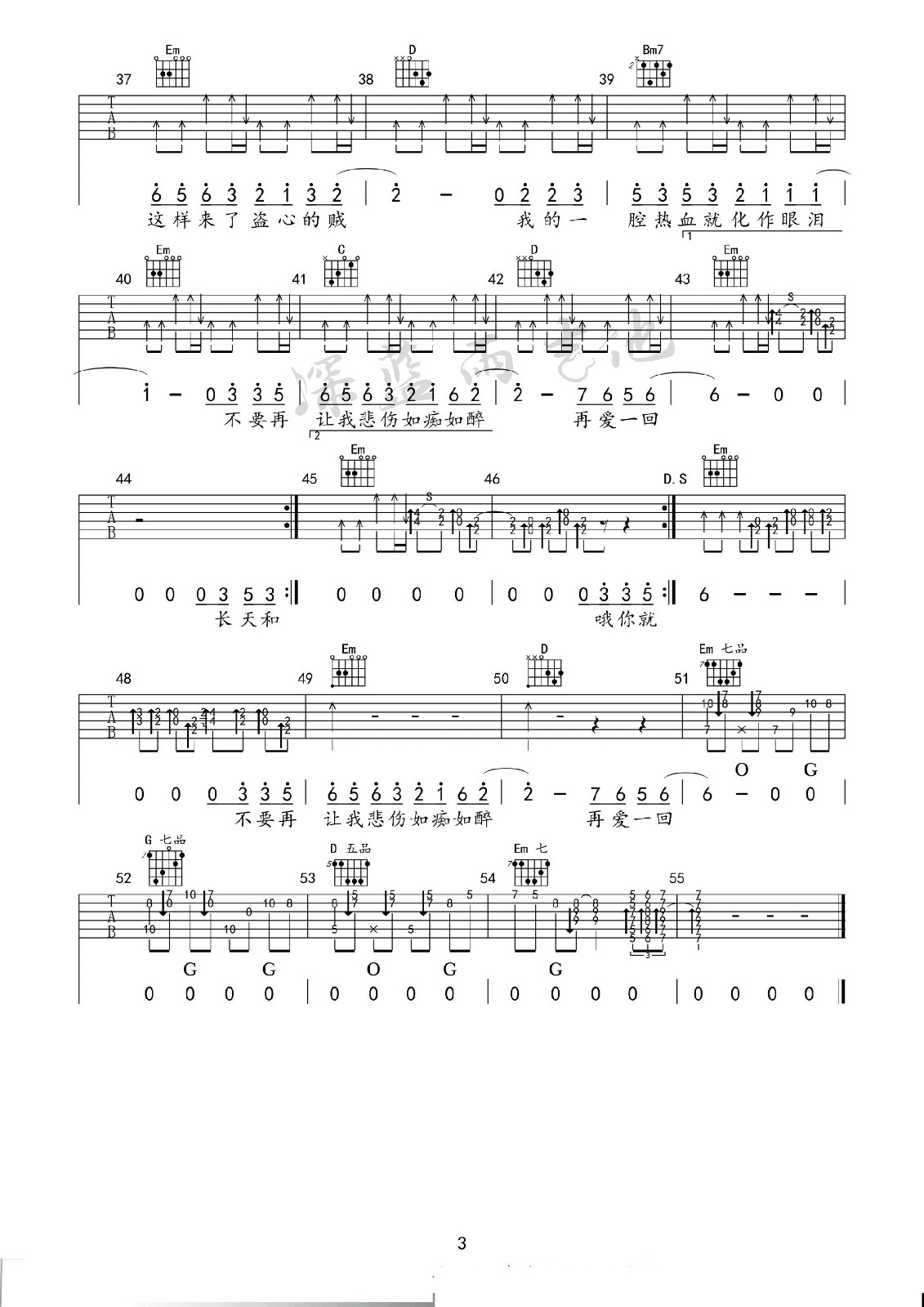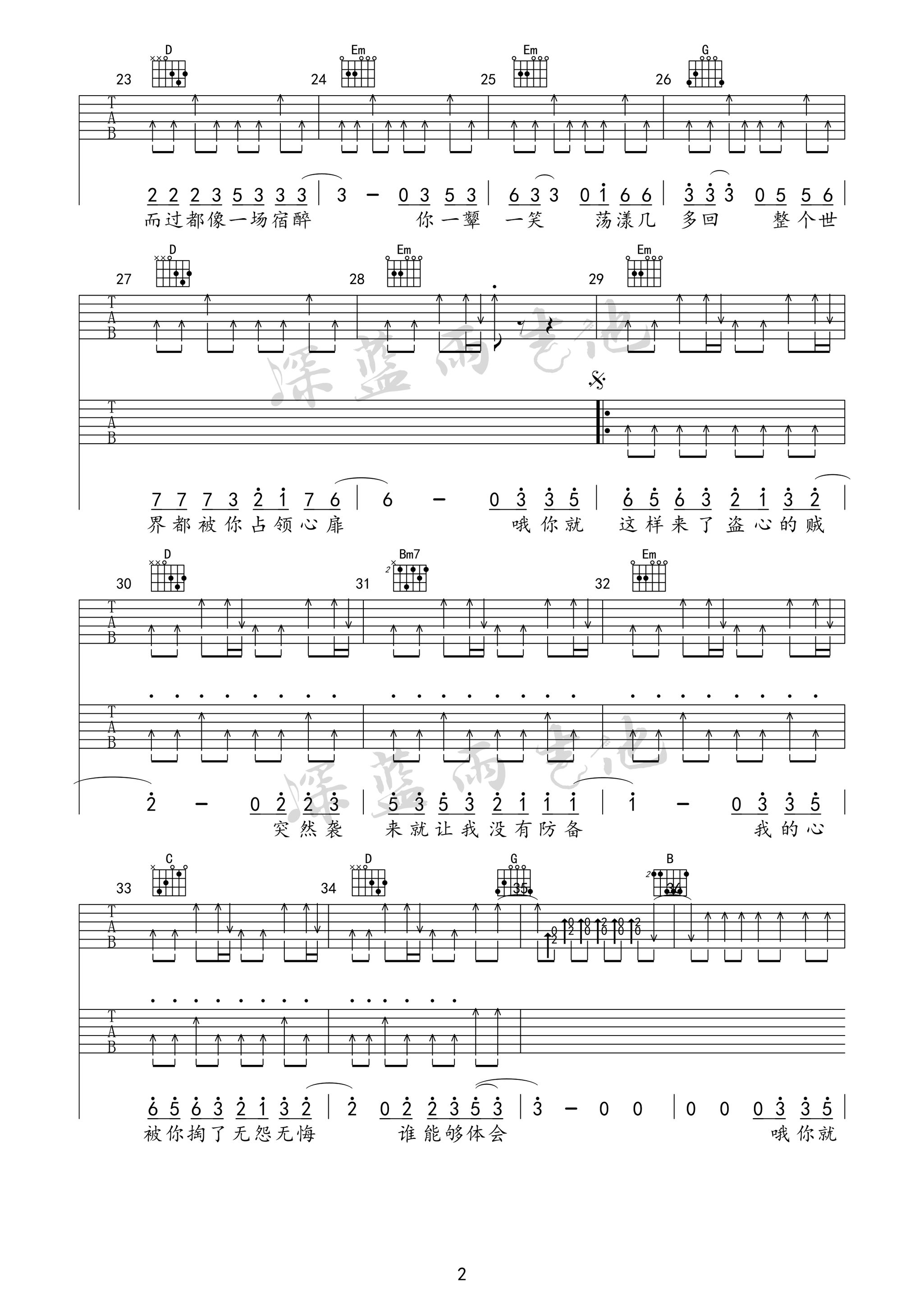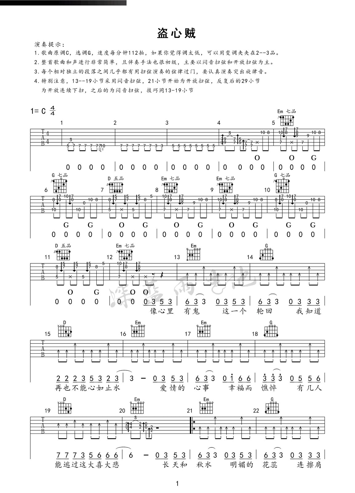 曲谱介绍: 黑龙《盗心贼》吉他弹唱谱,采用C调指法编配,深蓝雨吉他编配出品,共有3张高清图谱。