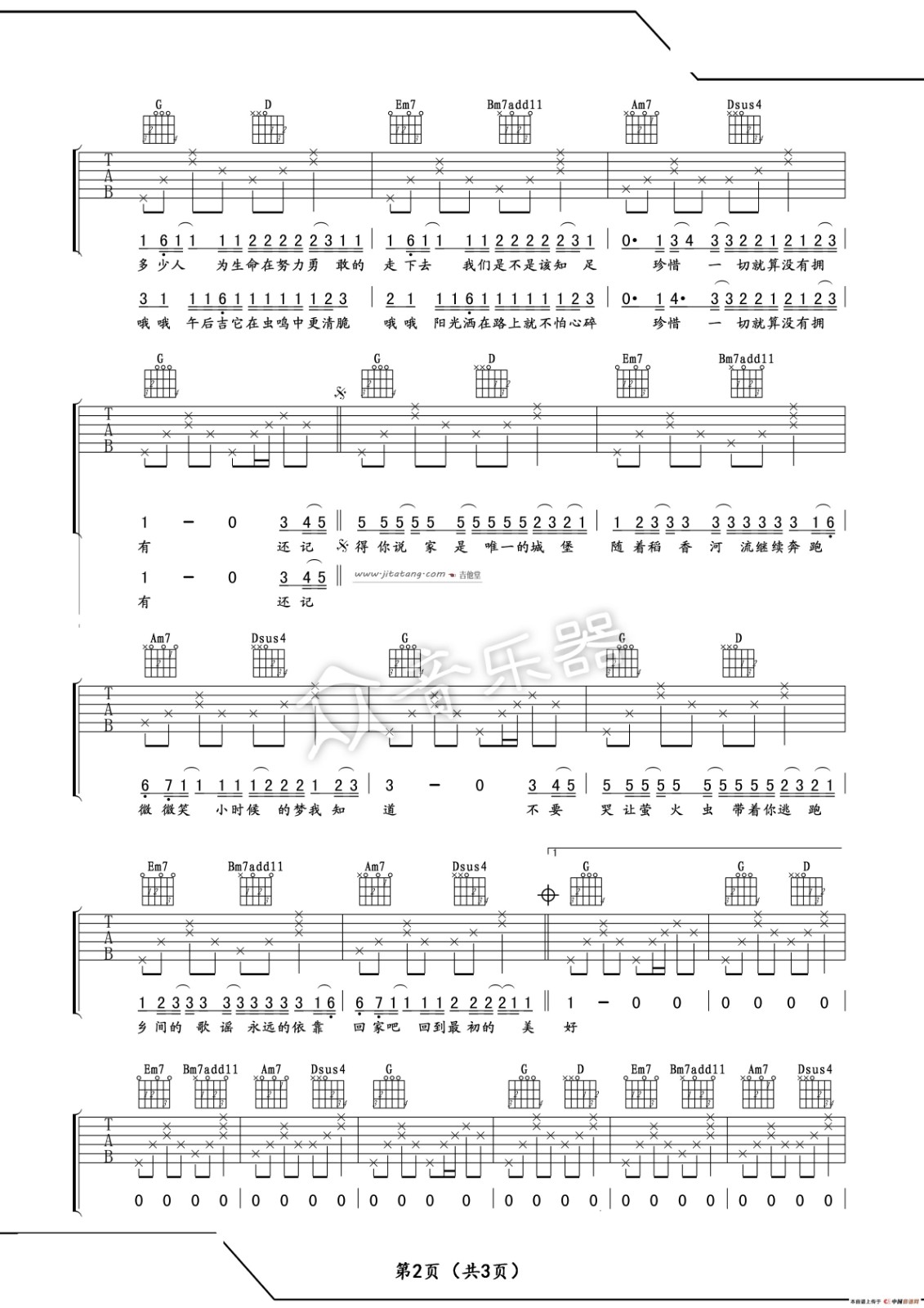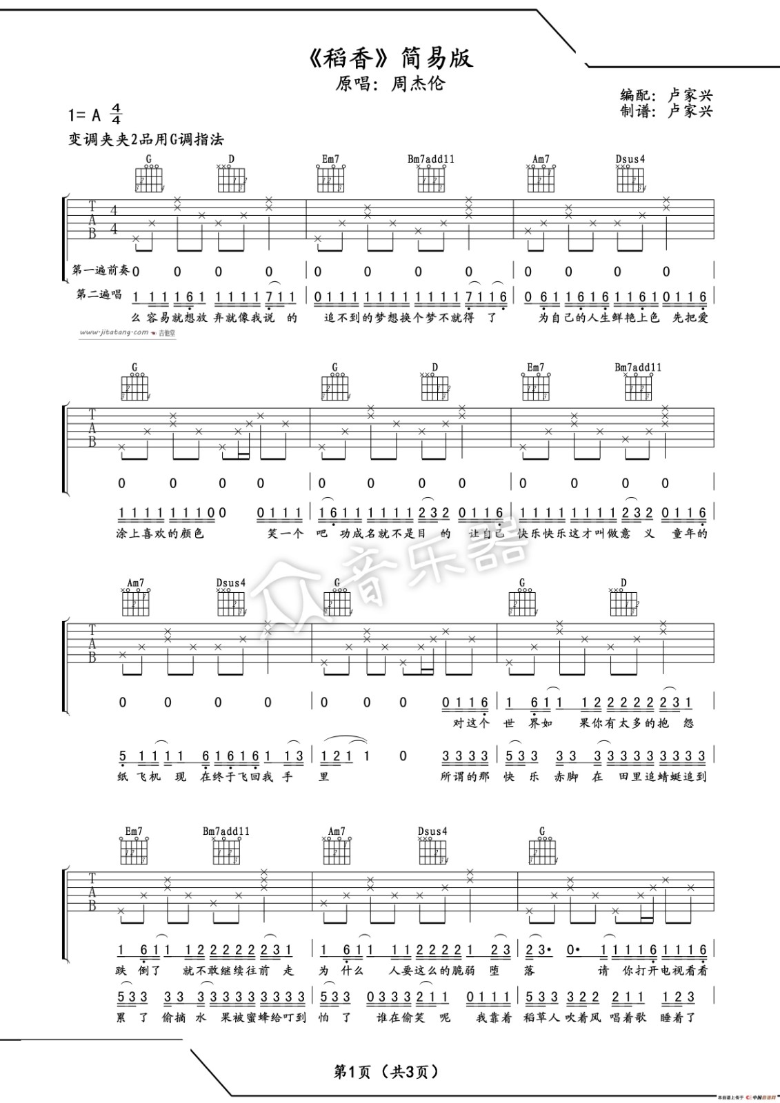 曲谱介绍: 周杰伦《稻香》吉他弹唱谱,采用A调指法编配,卢家兴编配出品,共有3张高清图谱。
