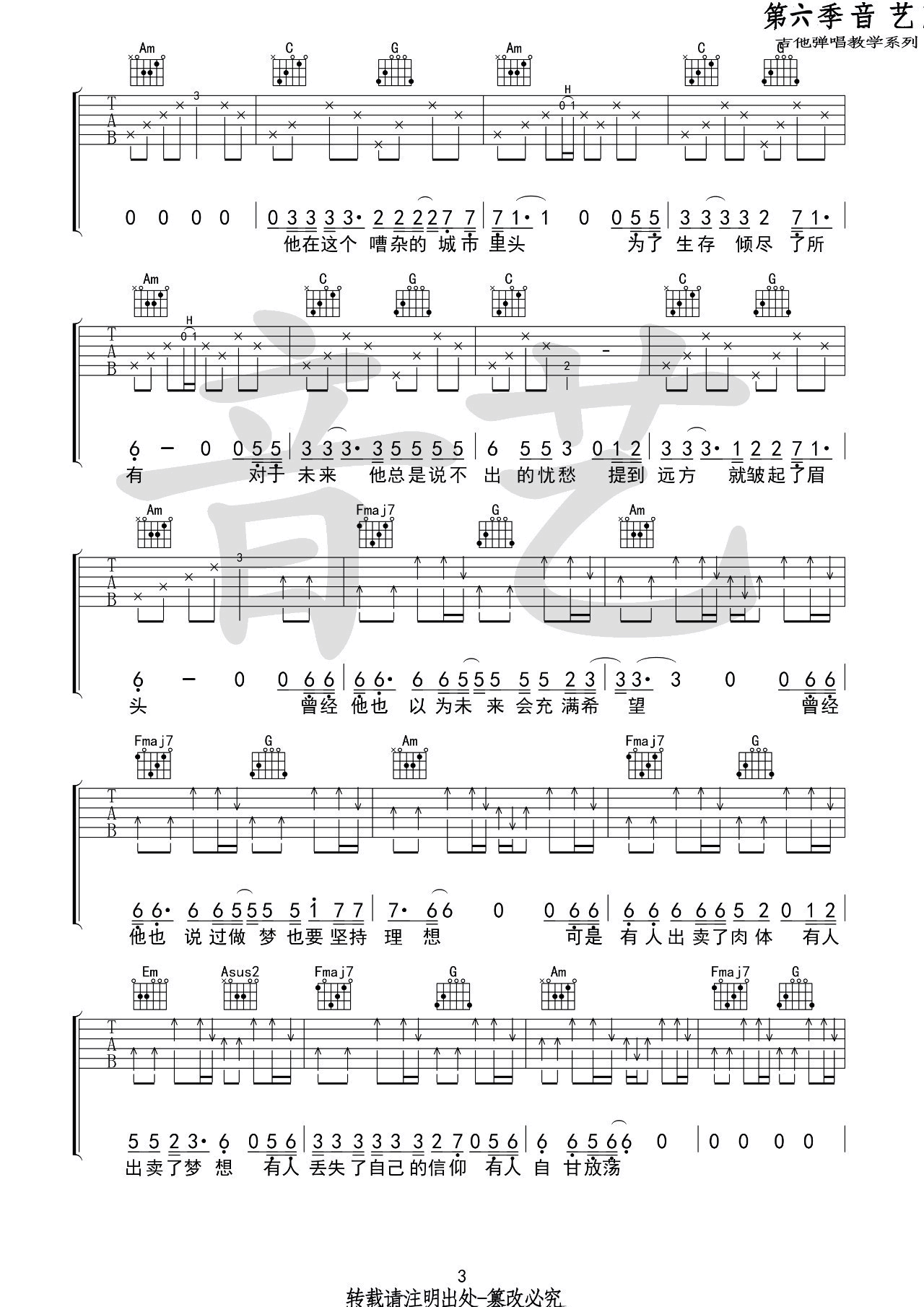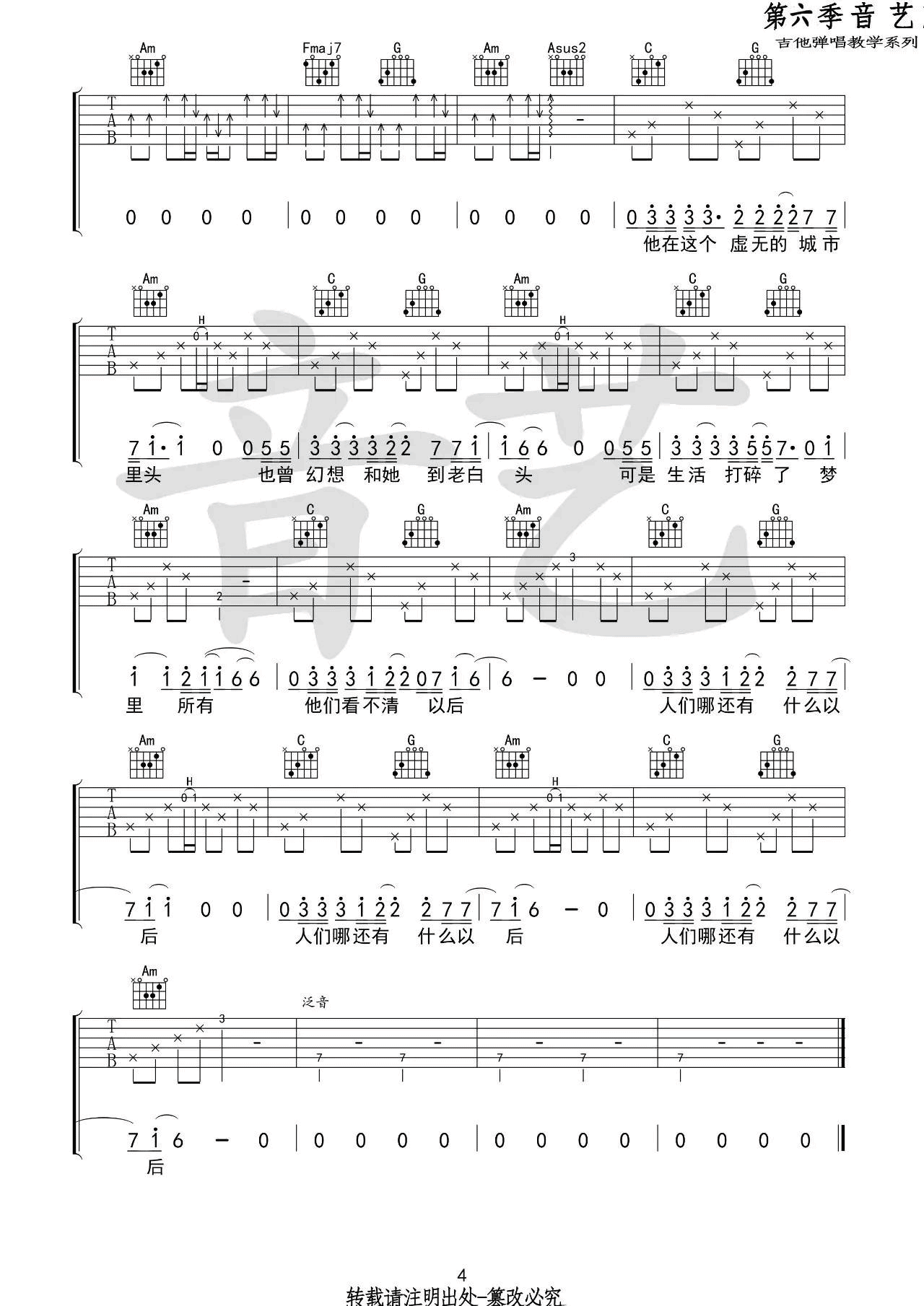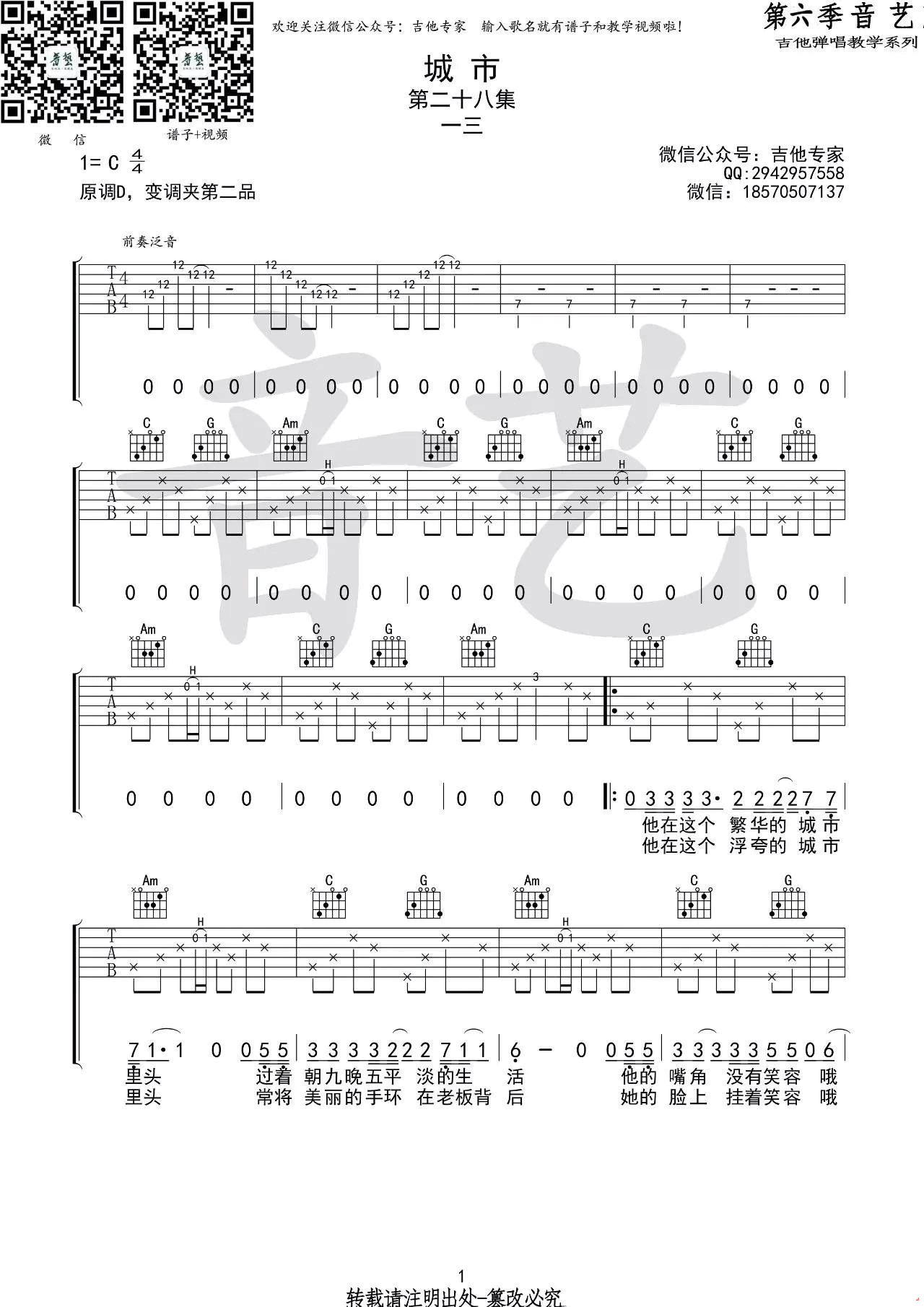曲谱介绍: 一三《城市》吉他弹唱谱,采用C调指法编配,音艺吉他编配出品,共有4张高清图谱。