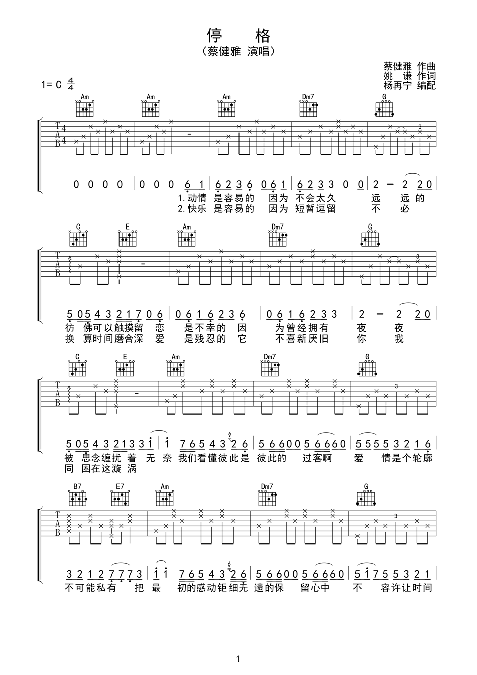 曲谱介绍: 蔡健雅《停格》吉他弹唱谱,采用C调指法编配,杨再宁编配出品,共有2张高清图谱,免翻页排版设计。