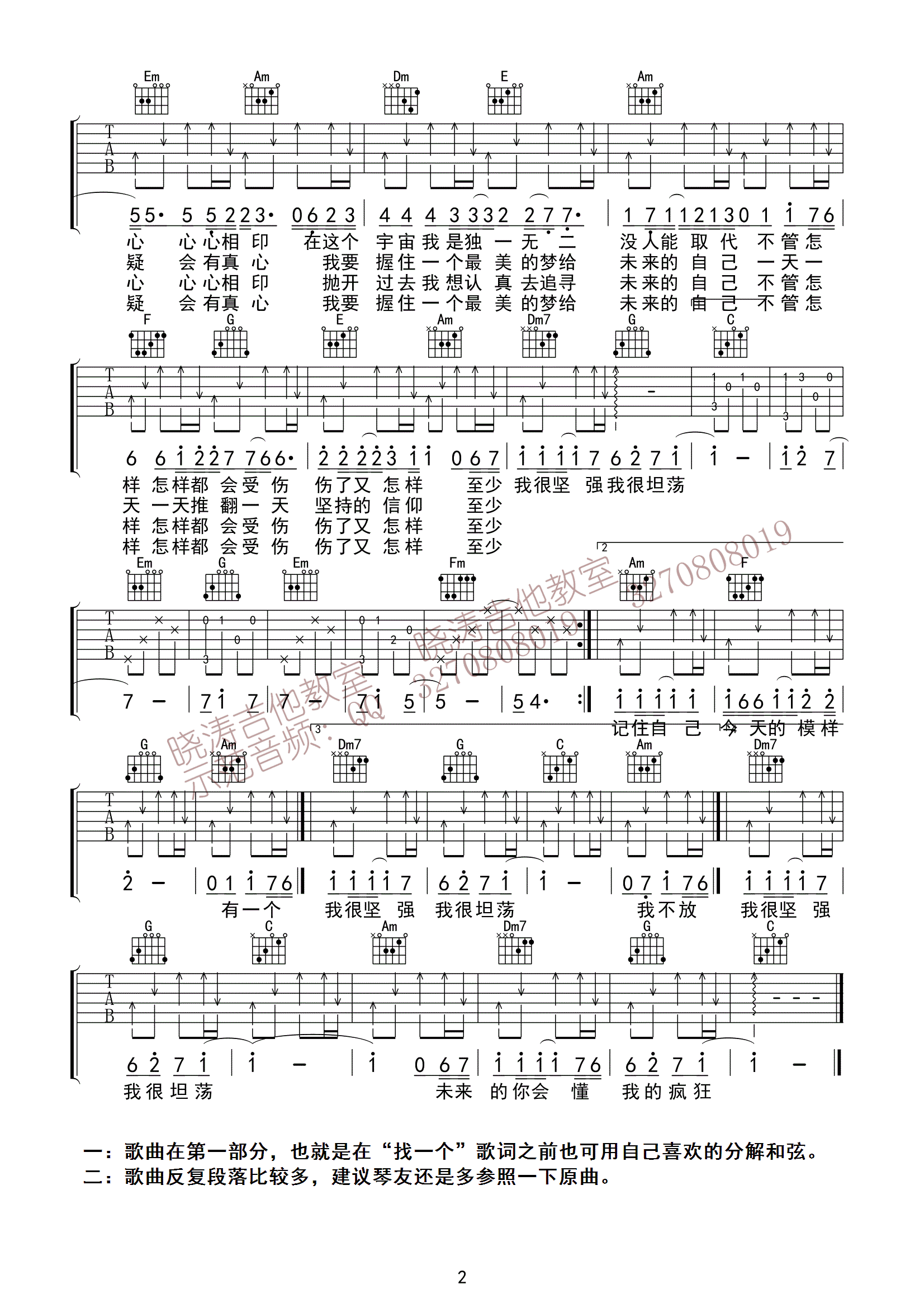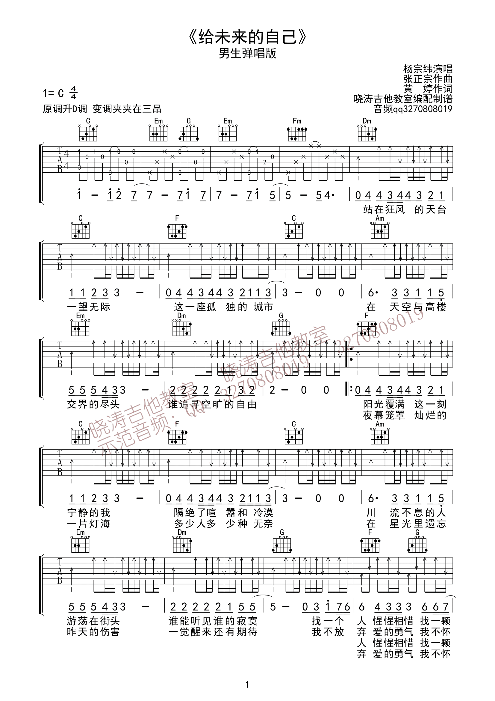 曲谱介绍: 杨宗纬《给未来的自己》吉他弹唱谱,采用C调指法编配,晓涛吉他编配出品,共有2张高清图谱,免翻页排版设计。