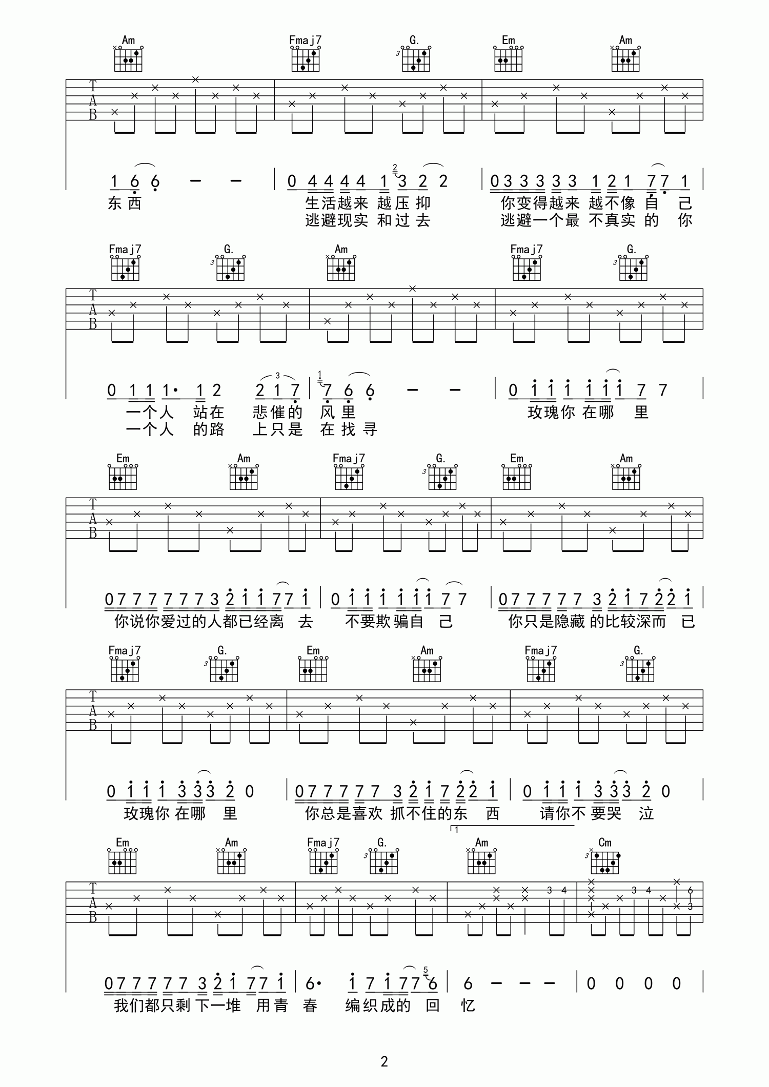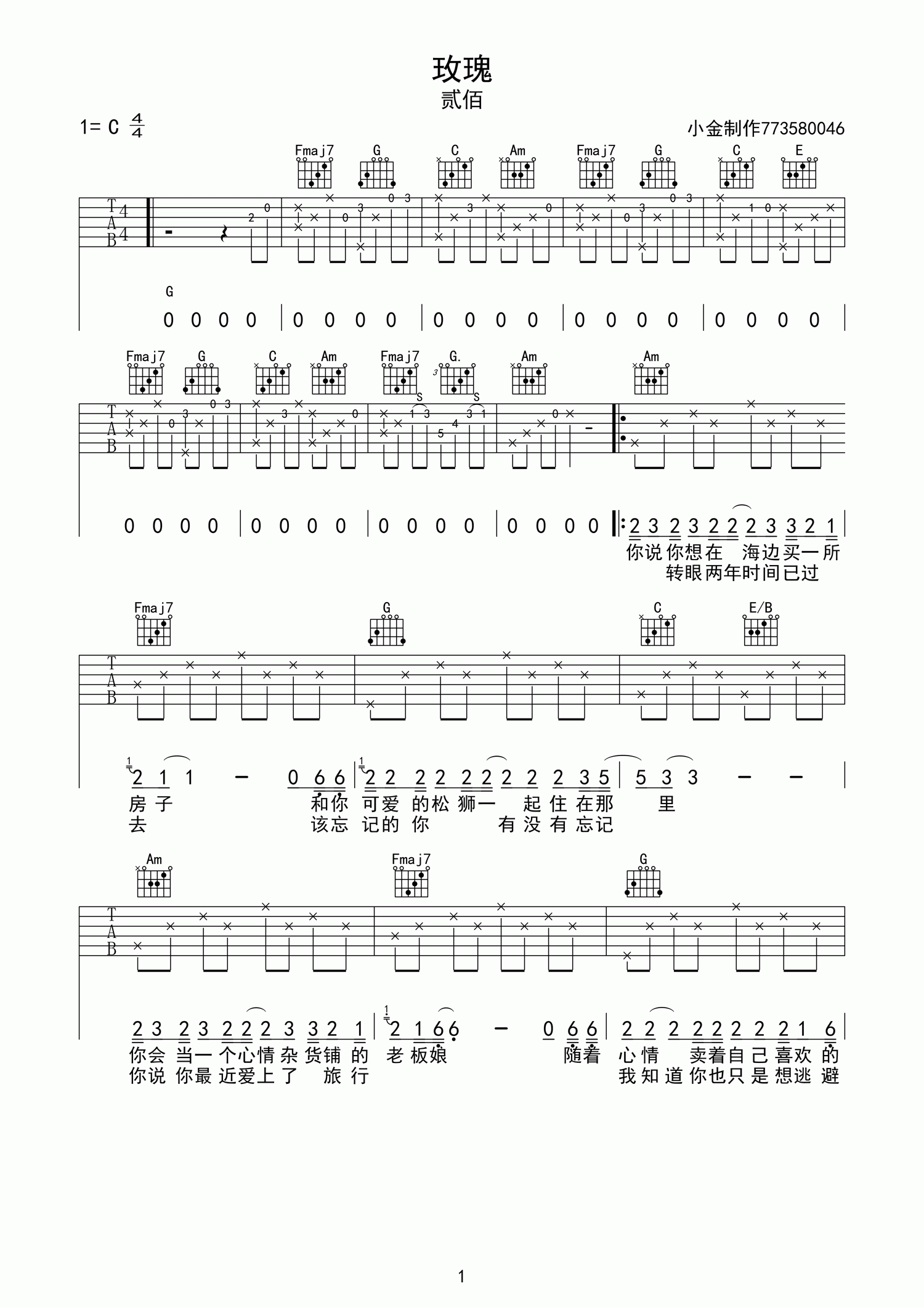 曲谱介绍: 贰佰《玫瑰》吉他弹唱谱,采用C调指法编配,小金编配出品,共有3张高清图谱。