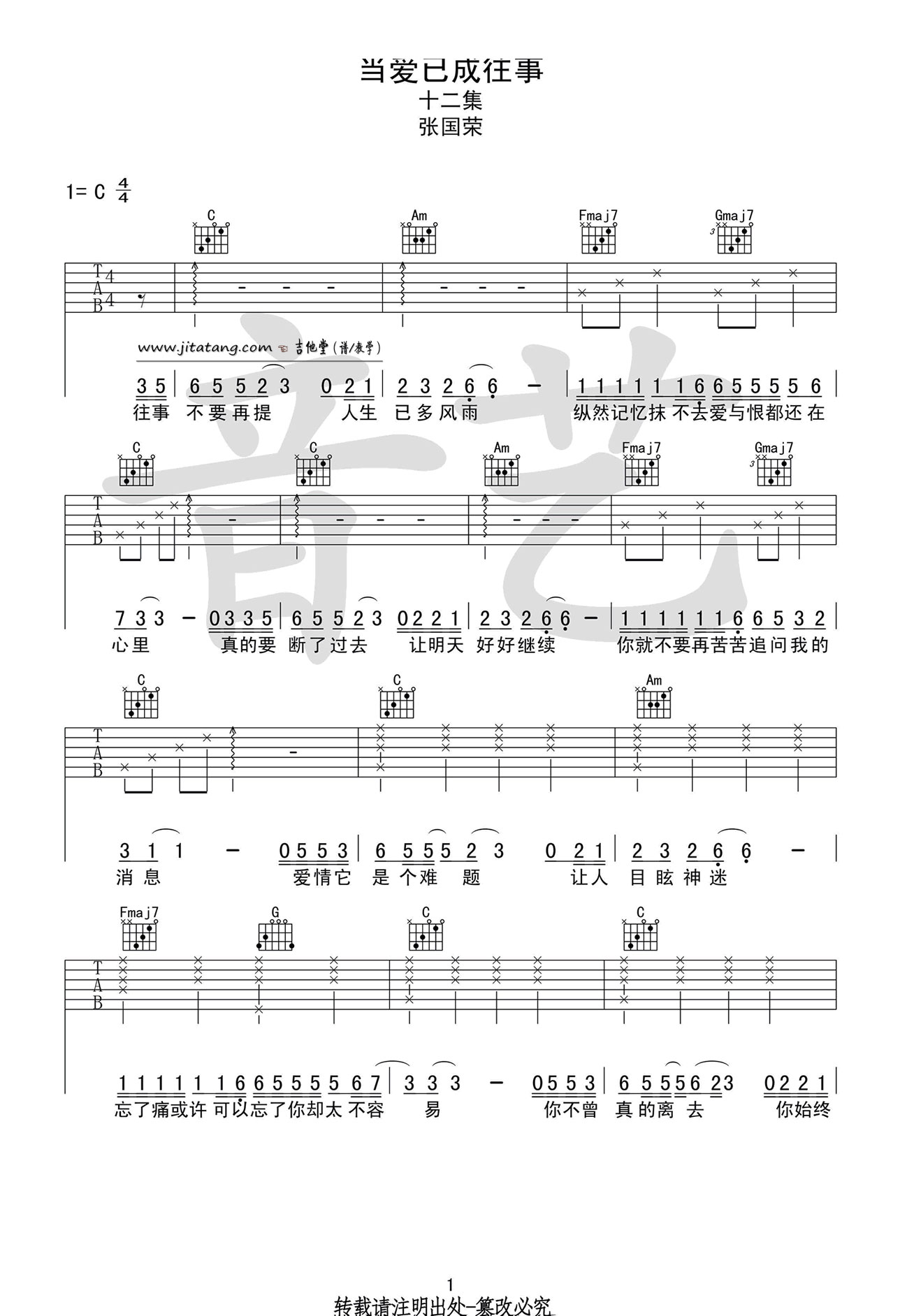 曲谱介绍: 张国荣《当爱已成往事》吉他弹唱谱,采用C调指法编配,音艺吉他编配出品,共有3张高清图谱。