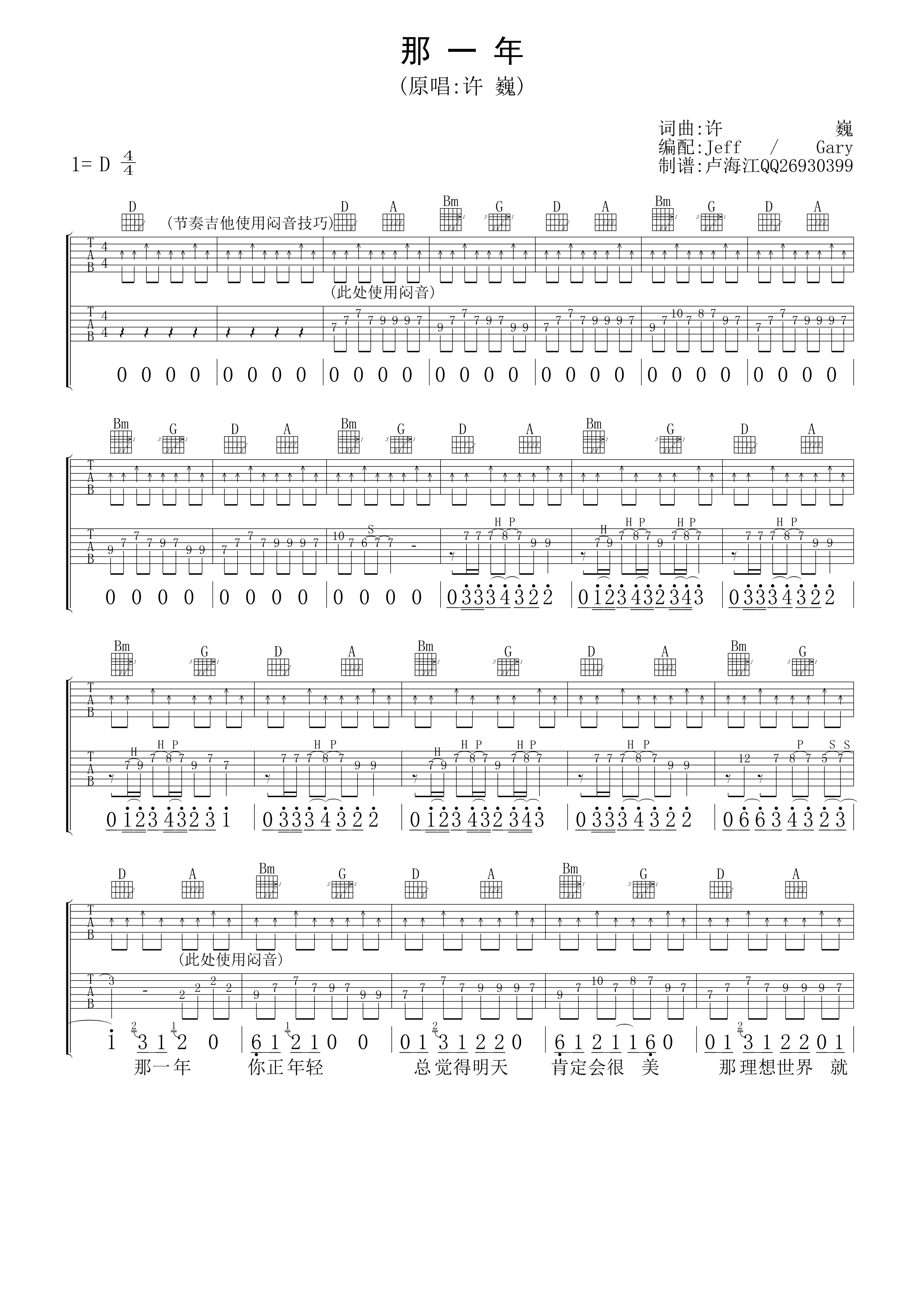 曲谱介绍: 许巍《那一年》吉他弹唱谱,采用D调指法编配,卢海江编配出品,共有4张高清图谱。