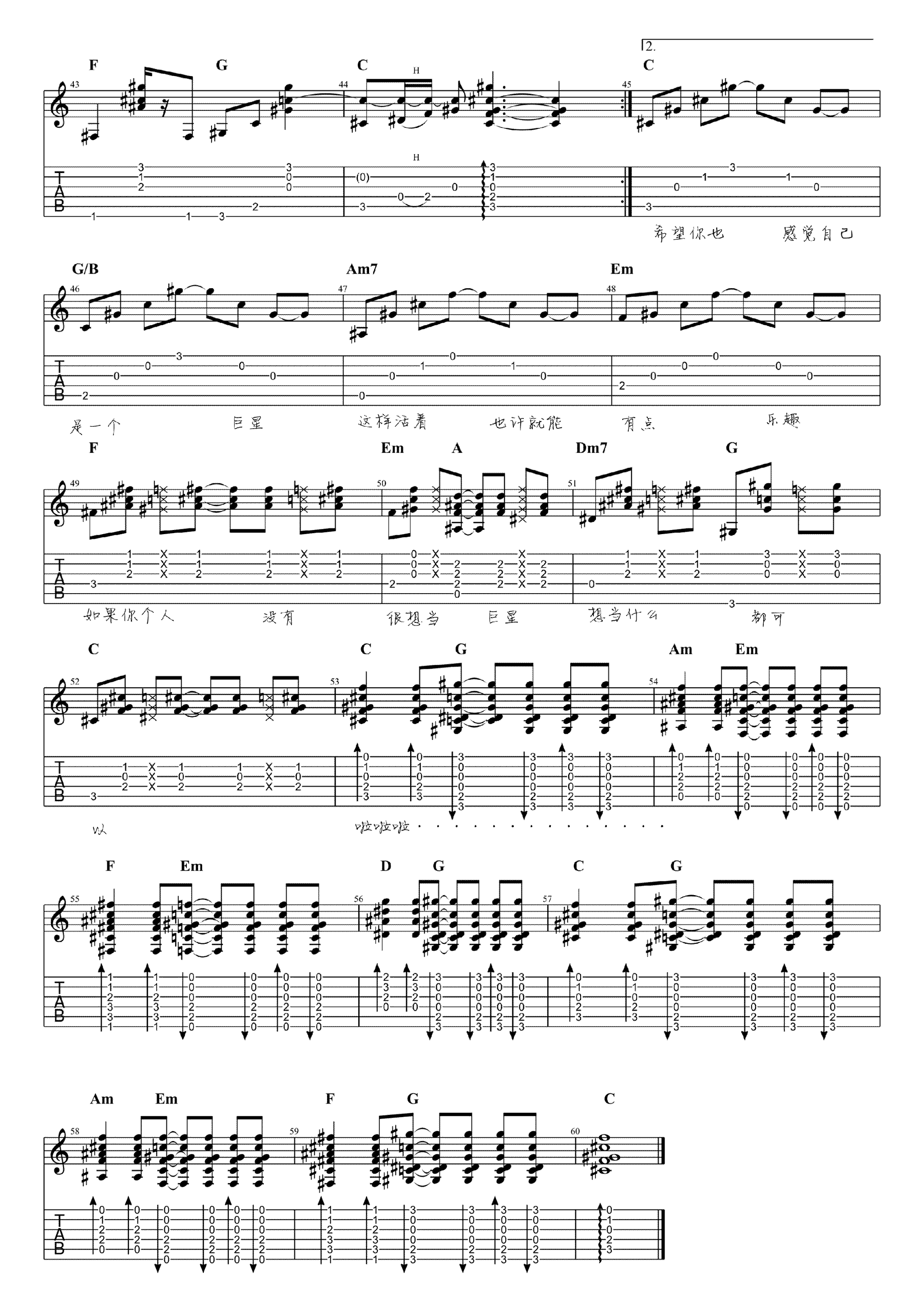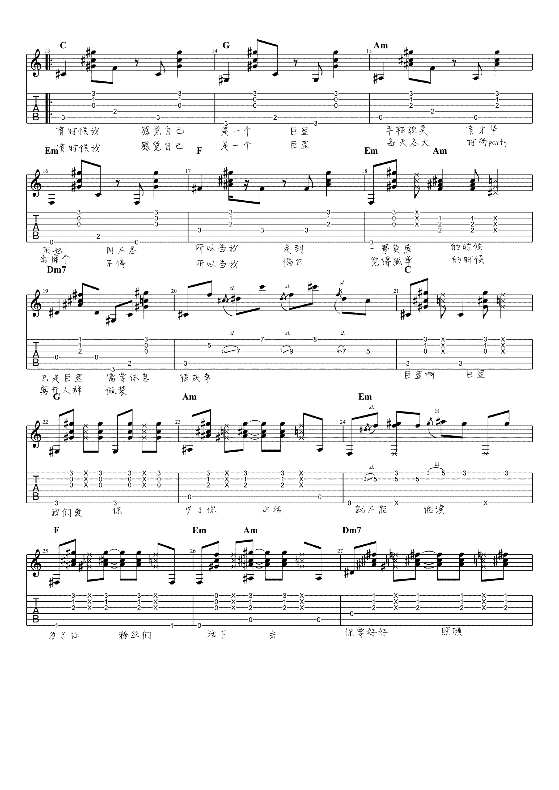 曲谱介绍: 毛不易《感觉自己是巨星》吉他独奏谱,采用C调指法编配,小NO师傅编配出品,共有4张高清图谱。