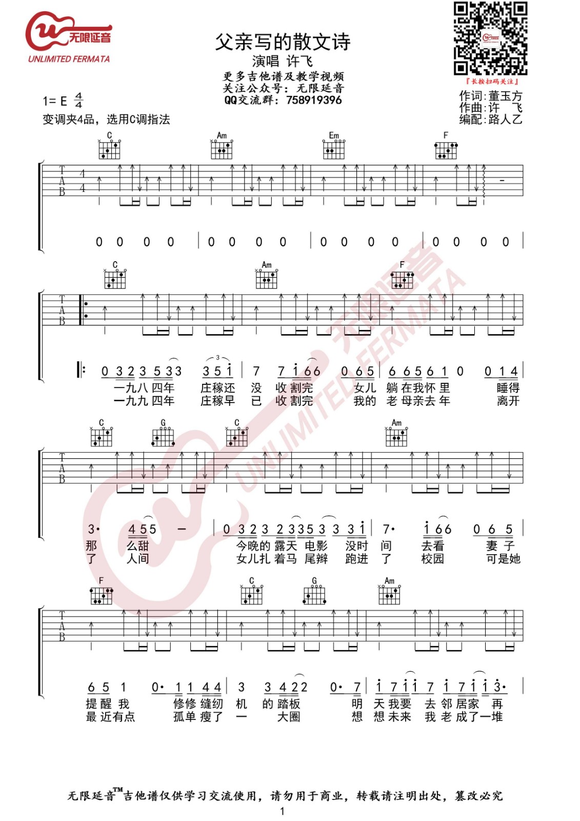 曲谱介绍: 许飞《父亲写的散文诗》吉他弹唱谱,采用C调指法编配,无限延音编配出品,共有3张高清图谱。