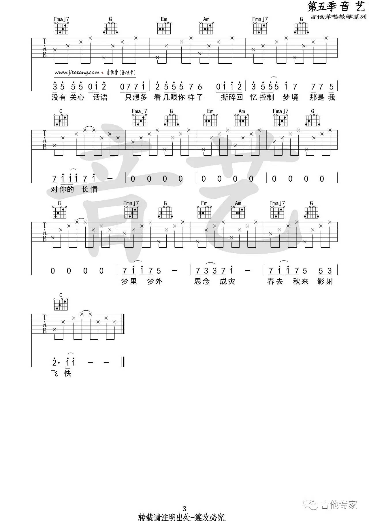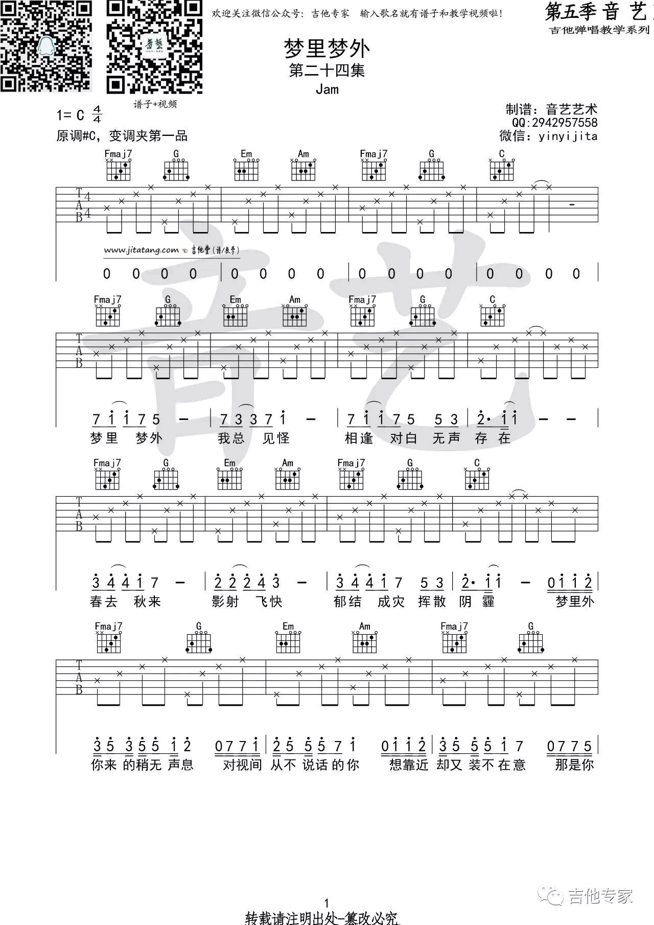 曲谱介绍: Jam《梦里梦外》吉他弹唱谱,采用C调指法编配,音艺吉他编配出品,共有3张高清图谱。