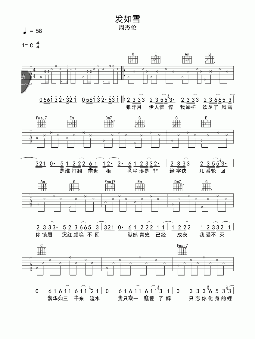 发如雪吉他谱 - 周杰伦 - C调吉他弹唱谱