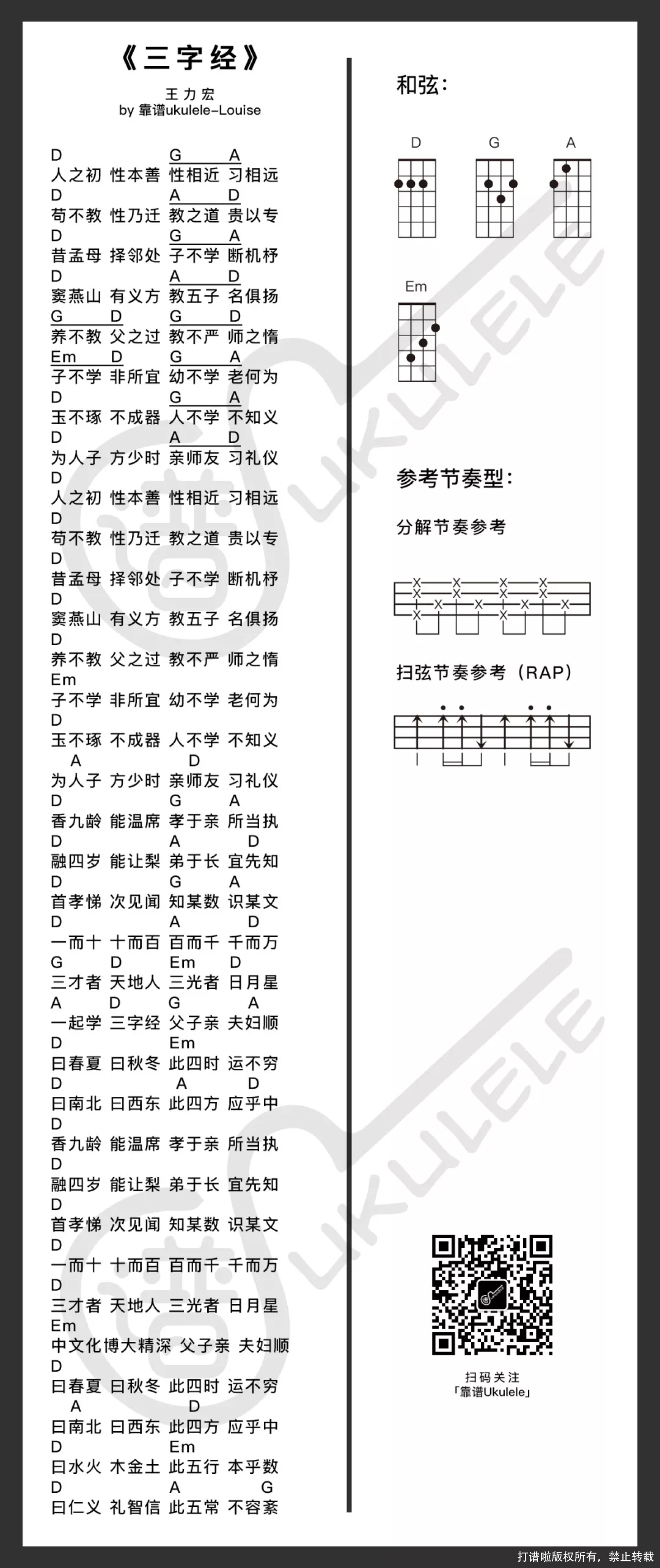 曲谱介绍: 一首出自《经典咏流传》的歌,《经典咏流传》是什么?这是一档央视推出的文化节目,这个节目用音乐包装经典诗词,一种很新鲜的感觉,相信也引起了不少人对于经典诗词的兴趣。 为什么分享这首歌? 歌是一个快毕业的小盆友在「有谱」APP上要的,毕业这件事离我很遥远了,虽然时间很赶,我也尽量制作了,希望能赶得及练习跟表演。毕业呀,无论什么时候都是值得回忆的经历呢~ 「三字经」不仅仅是一首朗朗上口、好听的歌,更让从小都没有记住「三字经」的我开始又有了记忆。整首歌和弦简单,容易哼唱。 听歌练琴学经典,一起来吧~   「三字经」弹唱谱