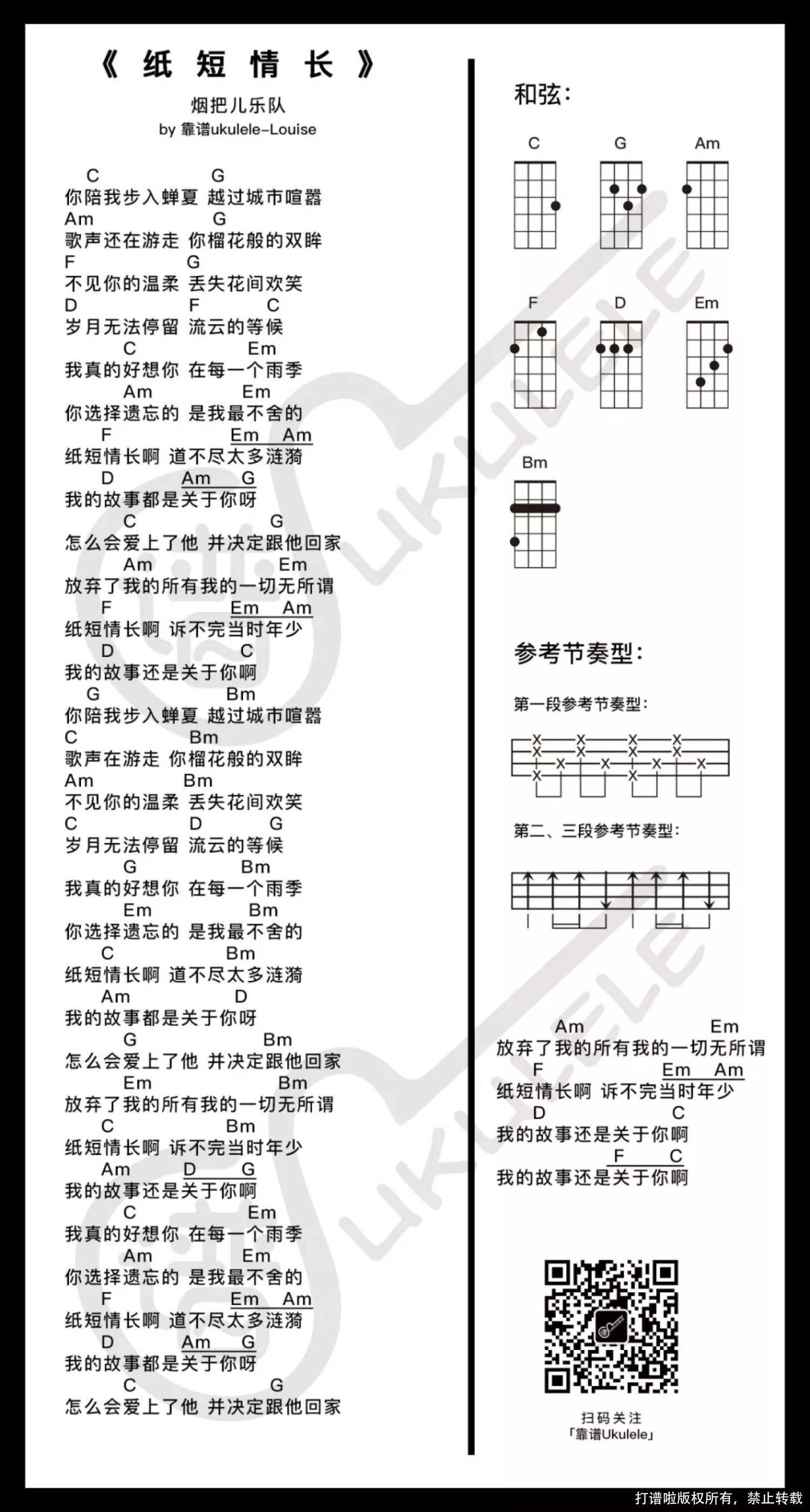 曲谱介绍: 最近留言中,好多人都在提到这首歌——「 纸短情长」,要指弹的、要弹唱的……留言中推荐我去听听,原本是没有很在意的,提到的人多了,引起了好奇,说是抖音最近很火的一首歌(之前下载不少短视频APP,不巧抖音是最初装了又卸载的APP之一……) 所以考虑了一下,还是蹭个热点(就是不懂多少人看到了哈哈哈),以下是原唱: Emmm……怎么说呢……原唱确实让我一度怀疑自己的听力有问题……哈哈哈哈,但是歌整体来说还是好听的歌! 由于这首歌有故事,就稍稍百度了一下,一句话引起了我的兴趣,这是一首翻唱要比原唱好听的歌,所以我听过原唱之后,去找了很多翻唱来听。 乐队自己还在微博上调侃,直接“承认”是一个开除了主唱就能红遍全宇宙的乐队,有趣有趣。 就先发个弹唱谱吧,指弹谱么……不确定我能不能发(重点!我非专业~仅是为了跟我一样的爱好者能找到自己想要的谱,毕竟茫茫「网」洋中,不是你要就一定有的~顺便求打赏哈哈哈哈哈哈随便说说的)。 一首歌制作时间周期是我无法控制给准确回复的,毕竟是利用业余时间,不在乎多少人关注,只希望来到这里的都可以交个朋友吧……留言没有回应我的,也一样做了记录,只要能发就争取…… 心情美丽的时候就做了这首歌,看官们自便吧~   「纸短情长」弹唱谱