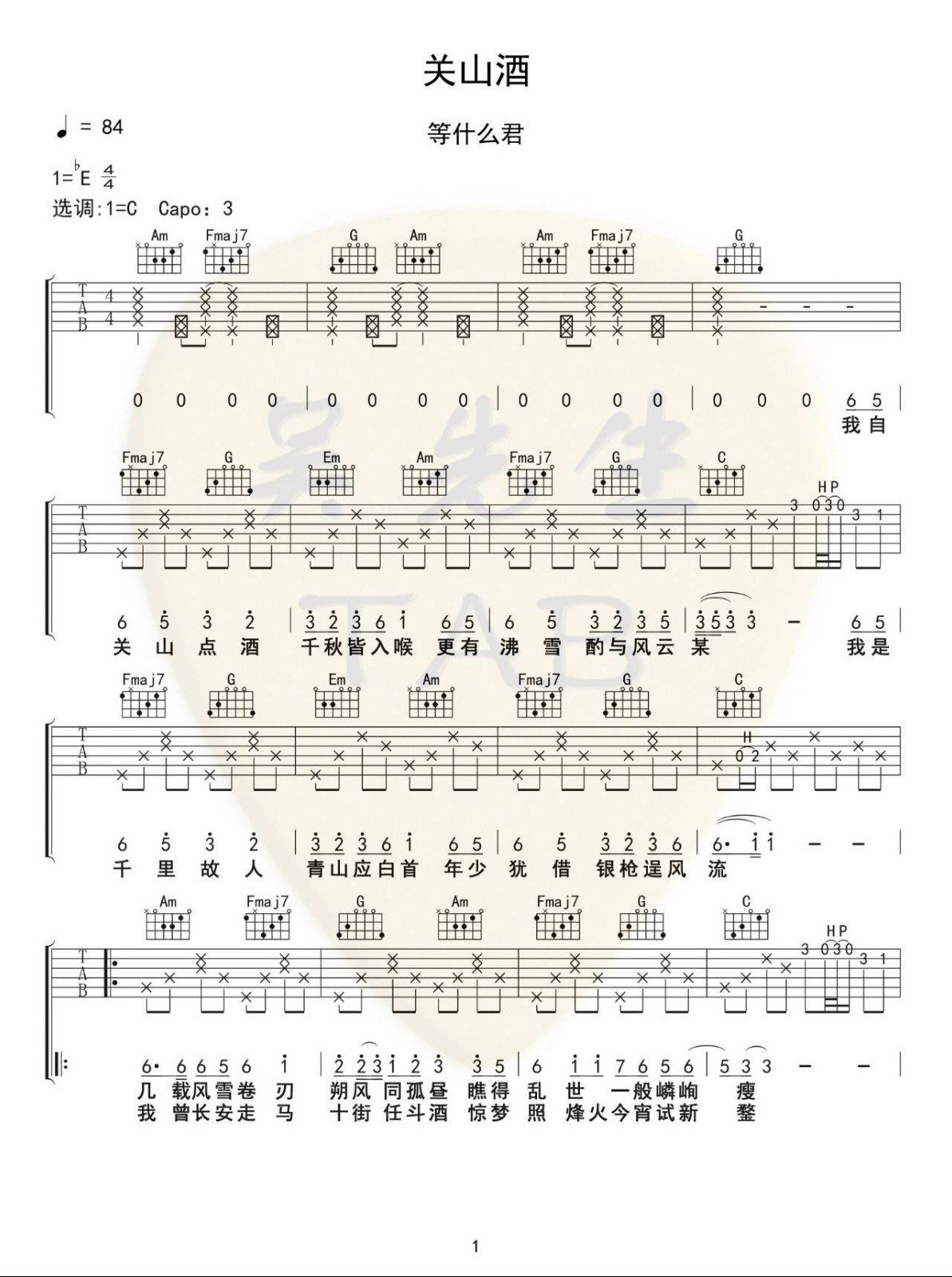 曲谱介绍: 等什么君/李袁杰《关山酒》吉他弹唱谱,采用C调指法编配,吴先生编配出品,共有3张高清图谱。