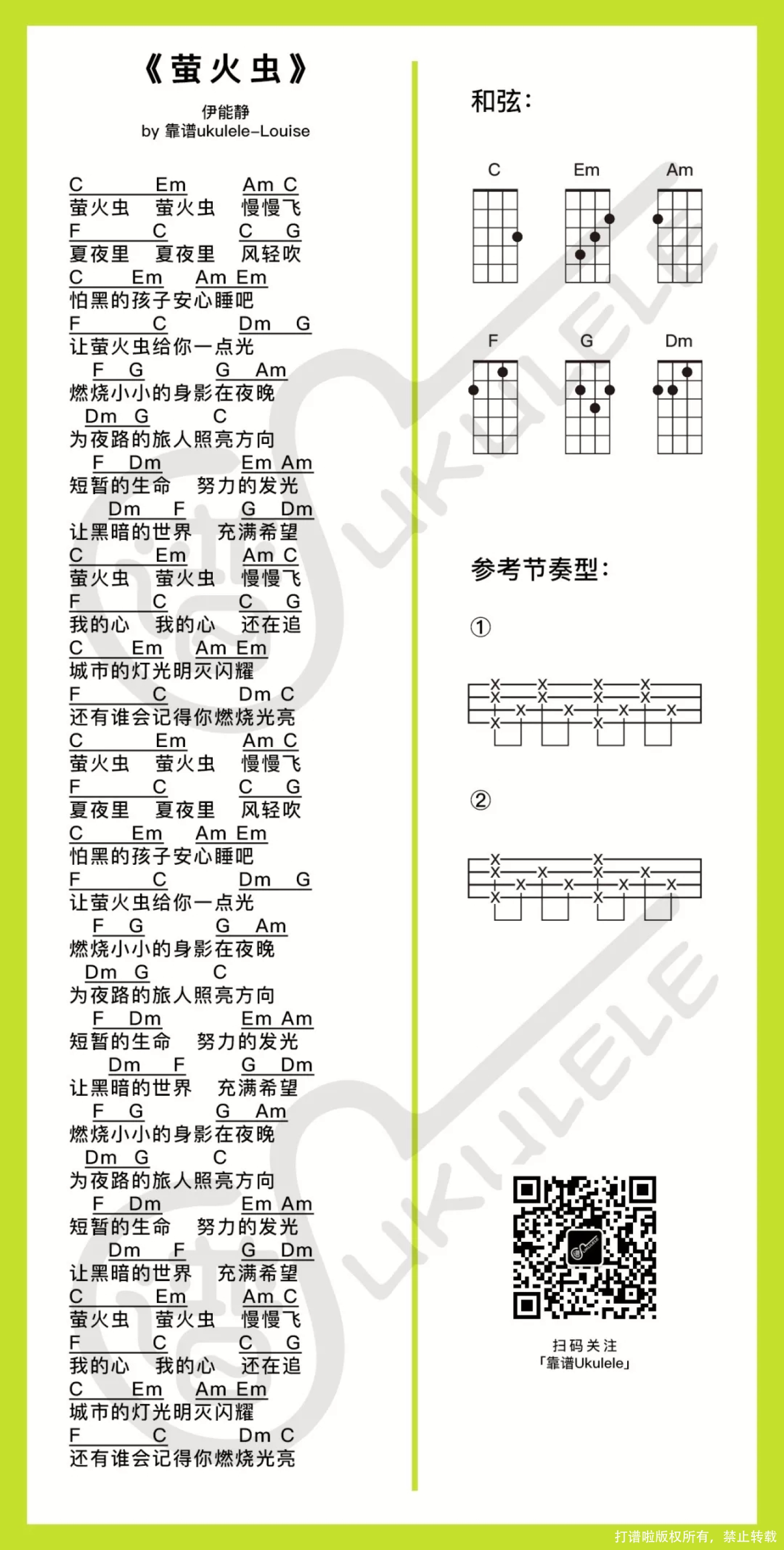 曲谱介绍: 这里不像其他人有什么每周一更新,或者每日更新……很羡慕啊,不过没有可比性(别拿这里去比较哦),别人是靠这个吃饭的(我久久的才会有个鸡腿加餐,哈哈哈哈哈哈,感谢加餐的小伙伴~谢谢支持)。 本次分享「萤火虫」,是伊能静演唱的,1993年世界展望会主题曲。真的是好多年前的歌了……这首歌应该可以算是一首适合小朋友的儿童流行歌吧,很容易学唱的一首。 这首歌选调C调,弹唱可能会有些高,和弦用到的都是无敌和弦,算是很容易上手的。如果有小伙伴Em和弦觉得按的不是很顺手的话,这首歌也可以使用Em7进行替代。(Em7的按法参考Ukulele常用和弦) 提供了两个参考节奏型,喜欢哪个选哪个哈。其实还有其他节奏型适合用就不都列出来了,适合慢歌的分解节奏型都可以尝试替换。   「萤火虫」弹唱谱 萤火虫,仅有的小小身躯发着一丝微光,就像普普通通的我们每个人,却在为了理想、生活努力奋斗。 就酱~(¦3[▓▓] 晚安!