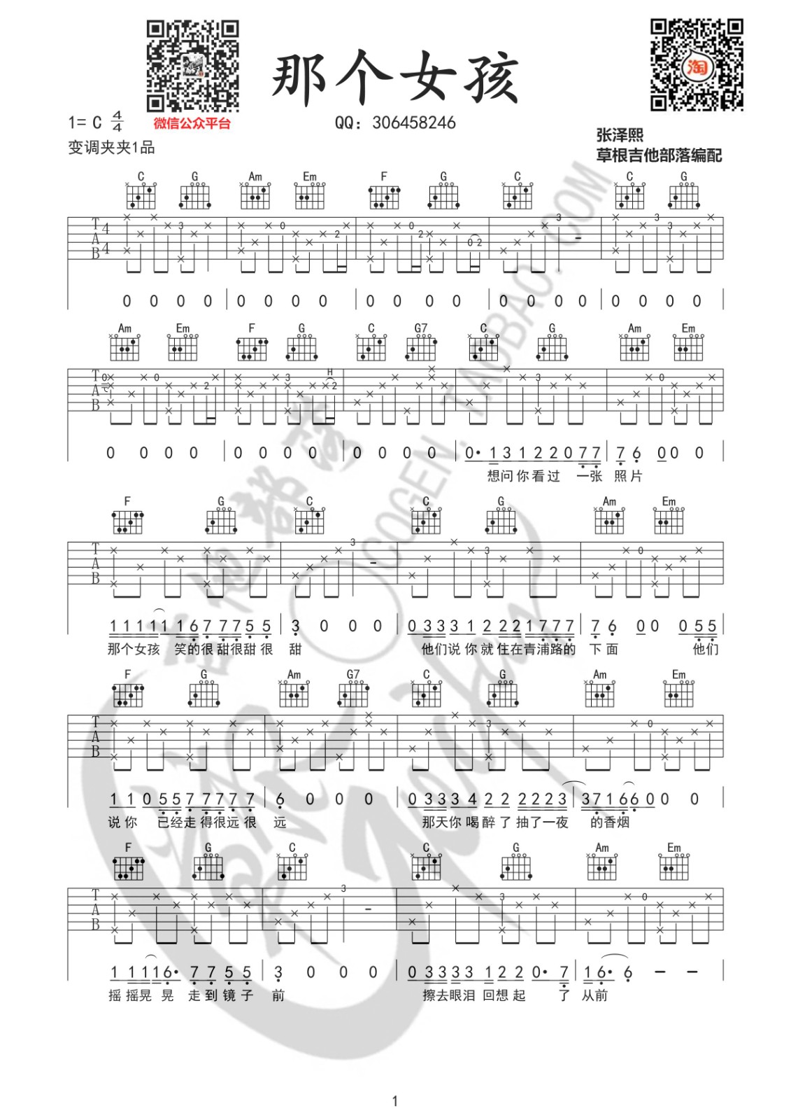 曲谱介绍: 张泽熙《那个女孩》吉他弹唱谱,采用C调指法编配,草根吉他部落编配出品,共有3张高清图谱。