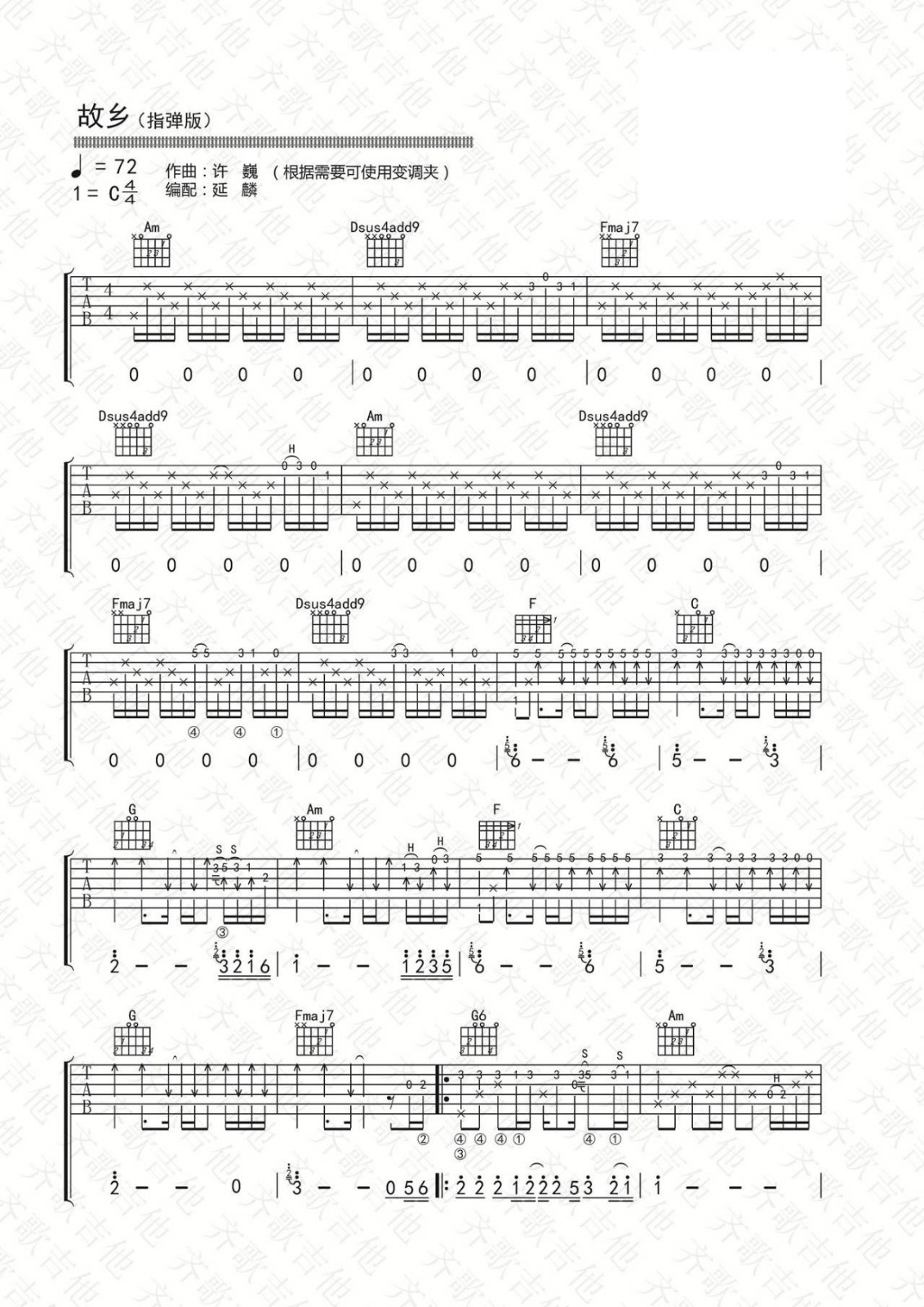 故乡吉他谱 - 许巍 - C调吉他独奏谱 - 原版