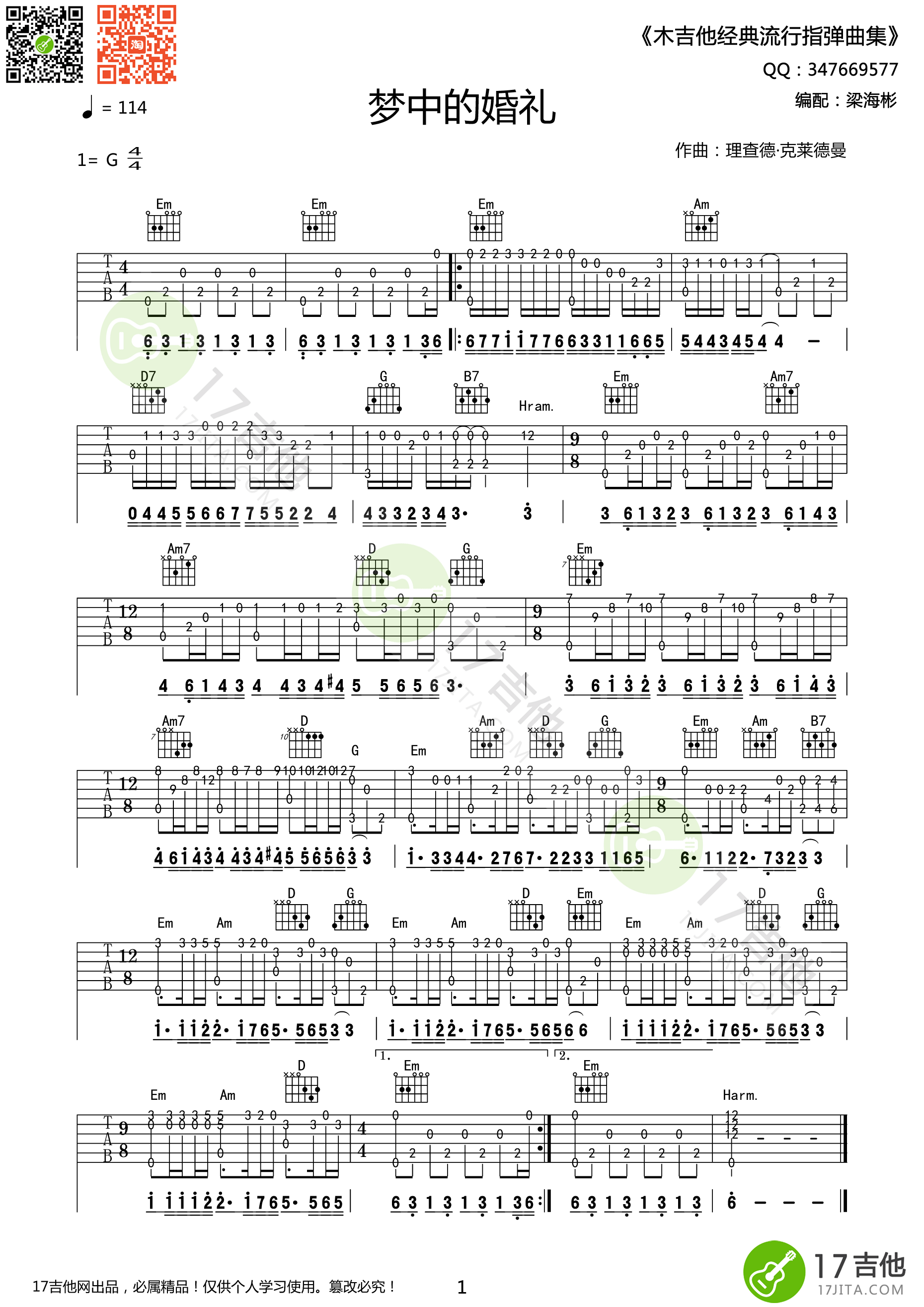曲谱介绍: 理查德·克莱德曼《梦中的婚礼》吉他独奏谱,采用G调指法编配,17吉他编配出品,共有1张高清图谱,免翻页排版设计。
