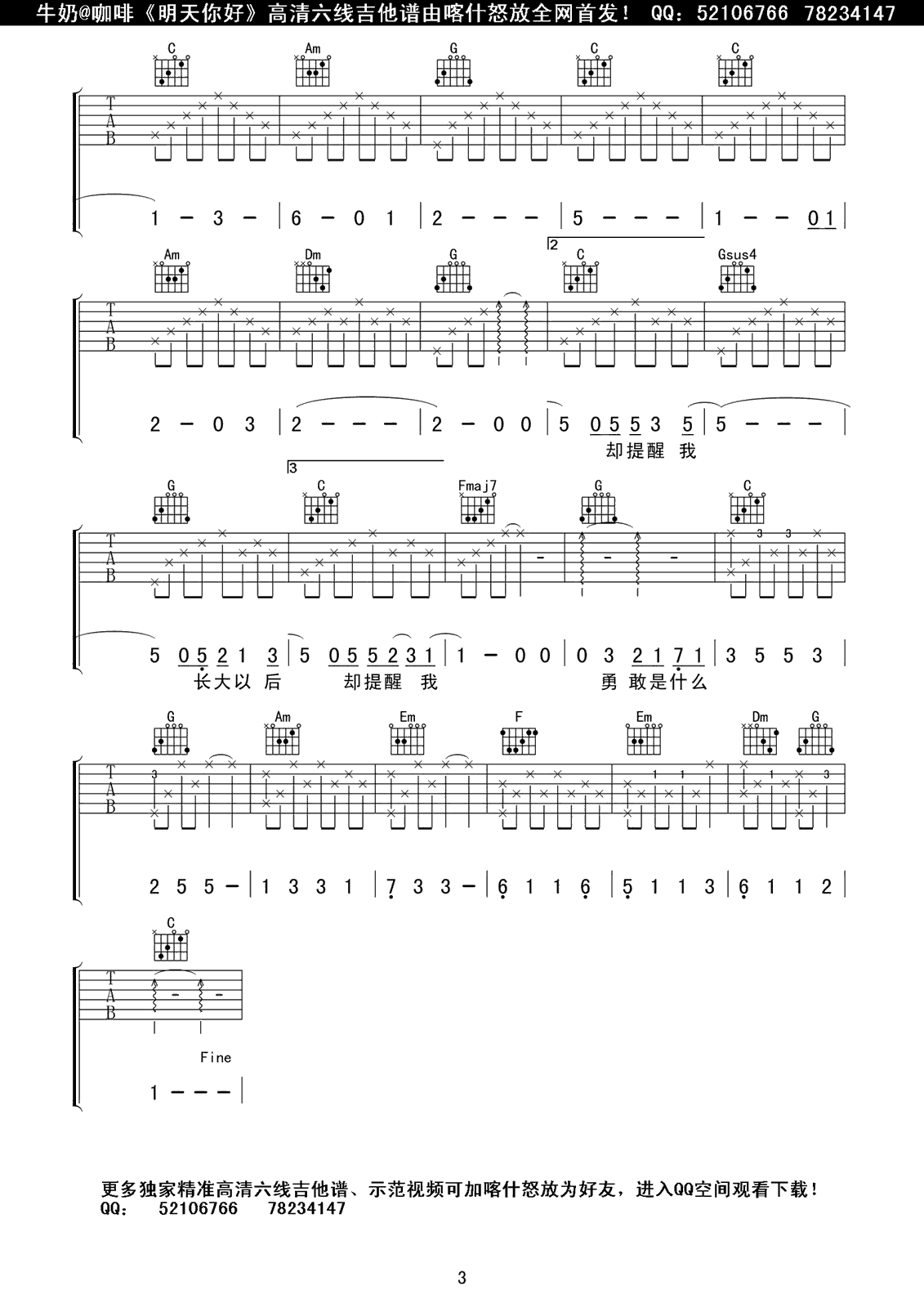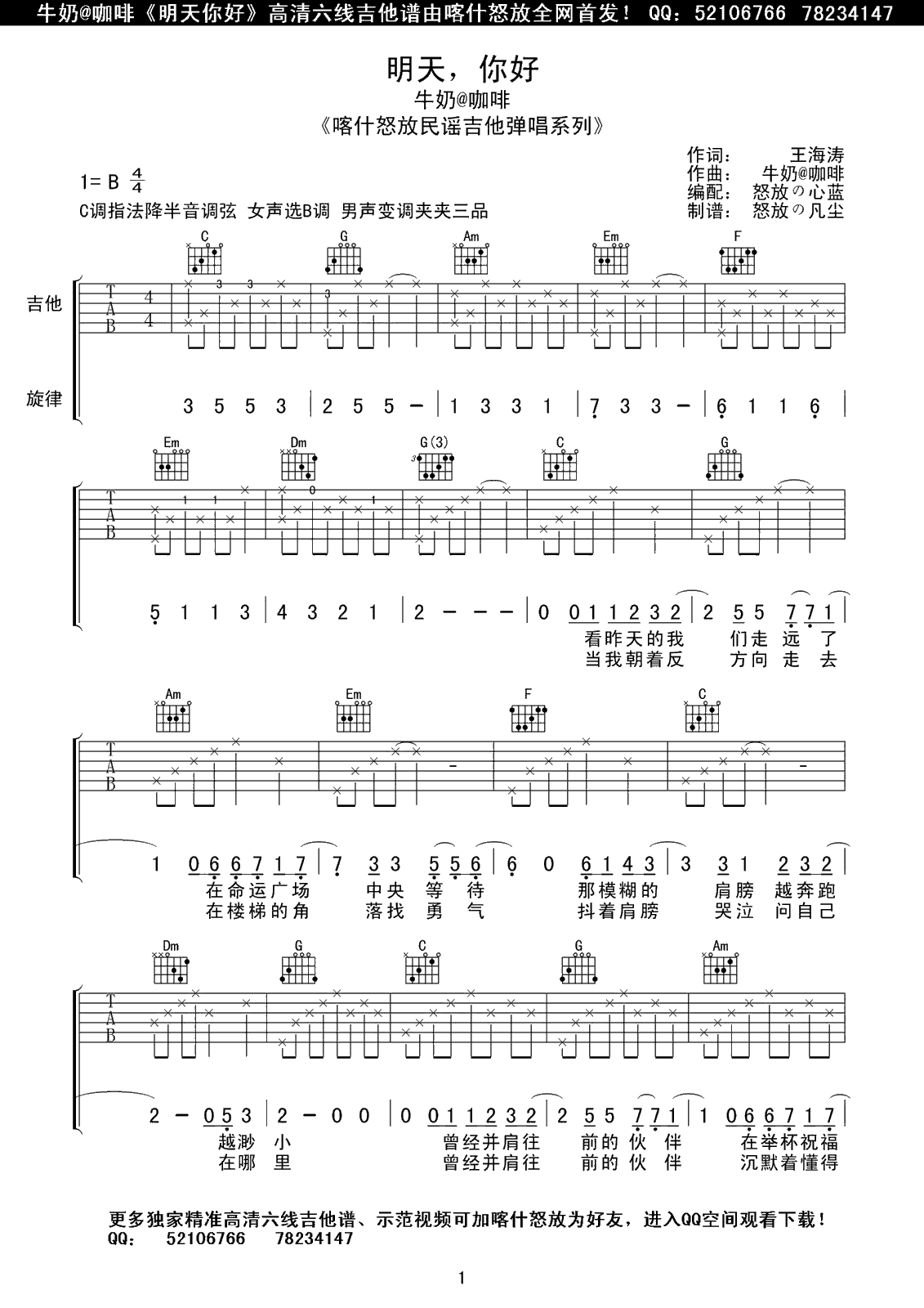 曲谱介绍: 牛奶咖啡《明天你好》吉他弹唱谱,采用B调指法编配,喀什怒放编配出品,共有3张高清图谱。