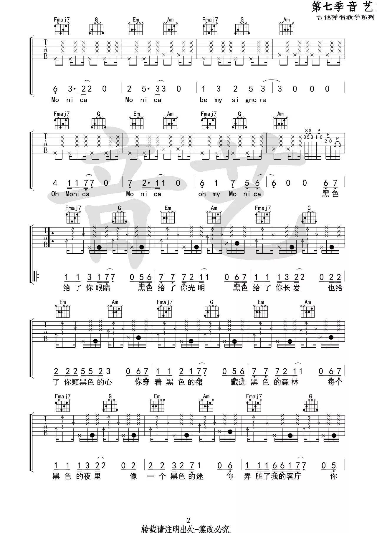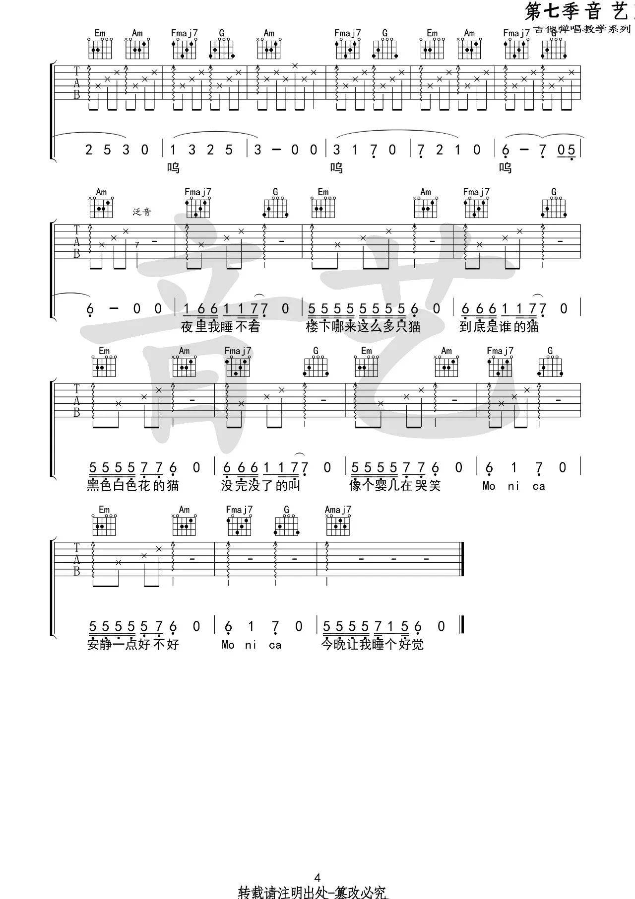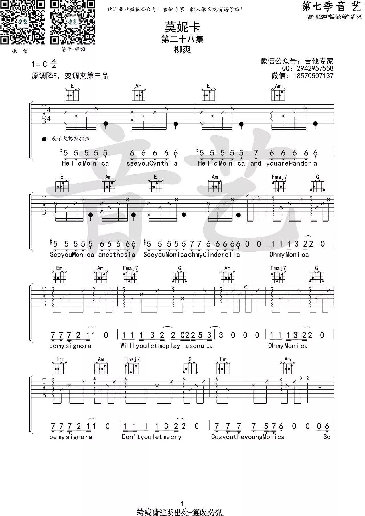 曲谱介绍: 刘爽《莫妮卡》吉他弹唱谱,采用C调指法编配,音艺吉他编配出品,共有4张高清图谱。