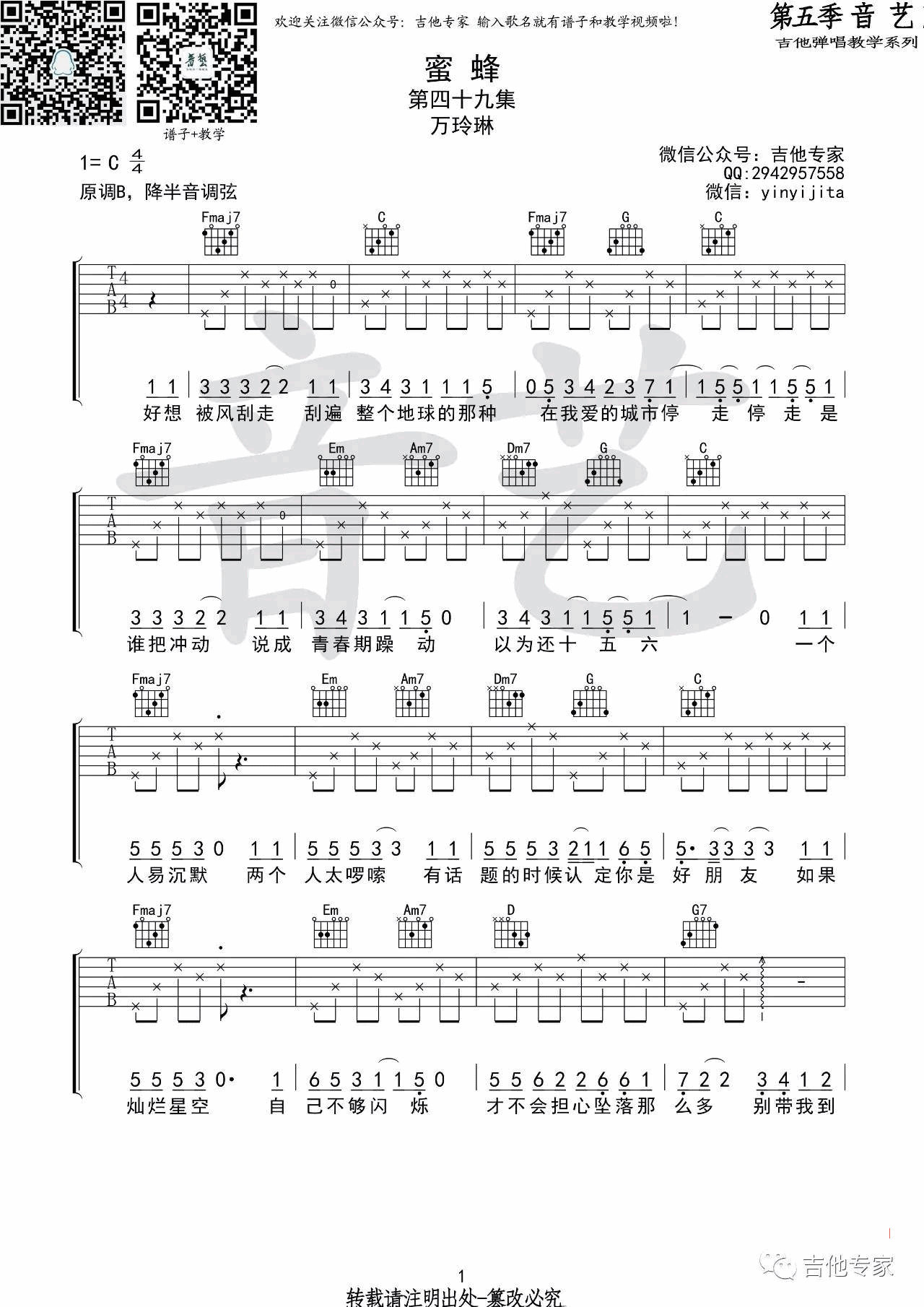 曲谱介绍: 万玲琳《蜜蜂》吉他弹唱谱,采用C调指法编配,音艺吉他编配出品,共有4张高清图谱。