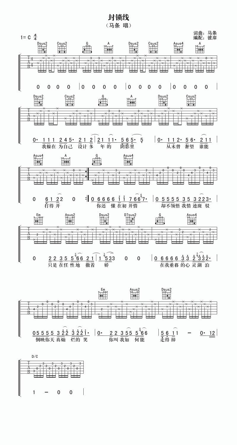 曲谱介绍: 马条《封锁线》吉他弹唱谱,采用C调指法编配,彼岸吉他编配出品,共有1张高清图谱,免翻页排版设计。
